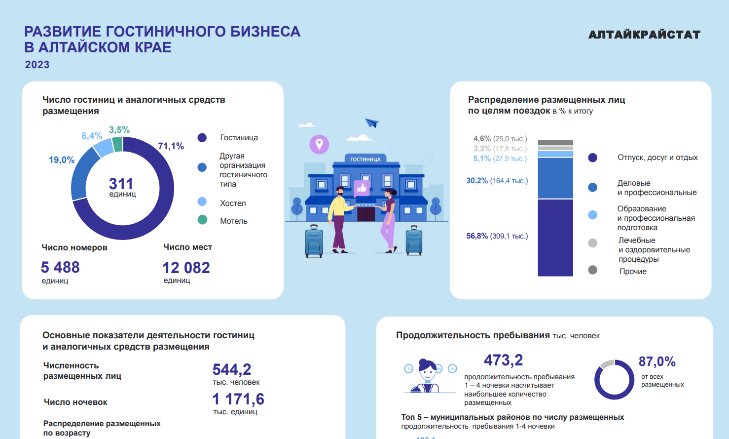 В 2023 году в Алтайском крае действовало 311 средств размещения гостиничного типа, наибольшую долю в них занимали гостиницы – 71,1%, мотели и хостелы – 9,9%, другие организации гостиничного типа – 19,0%.