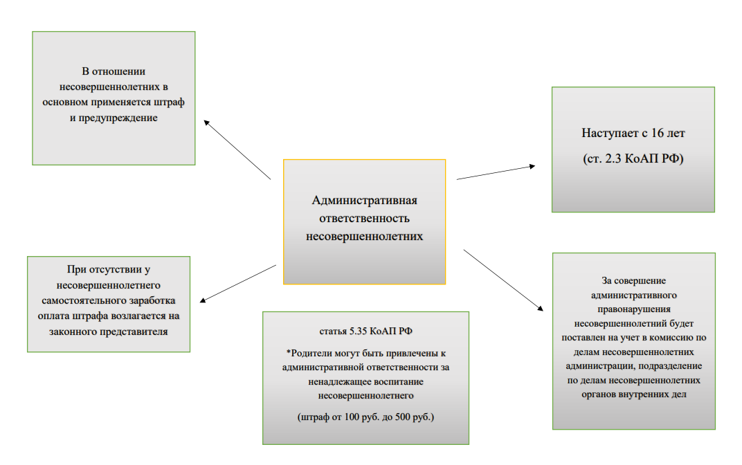 Формирование у подростков отклоняющегося от норм приличия поведения, как правило, начинается с мелких «бытовых» нарушений, большая часть которых относятся к административным. Административное правонарушение – это противоправное, виновное действие (бездействие), за которое Кодексом Российской Федерации об административных правонарушениях или законами субъектов Российской Федерации об административных правонарушениях установлена административная ответственность (ст. 2.1 Кодекса Российской Федерации об административных правонарушениях).