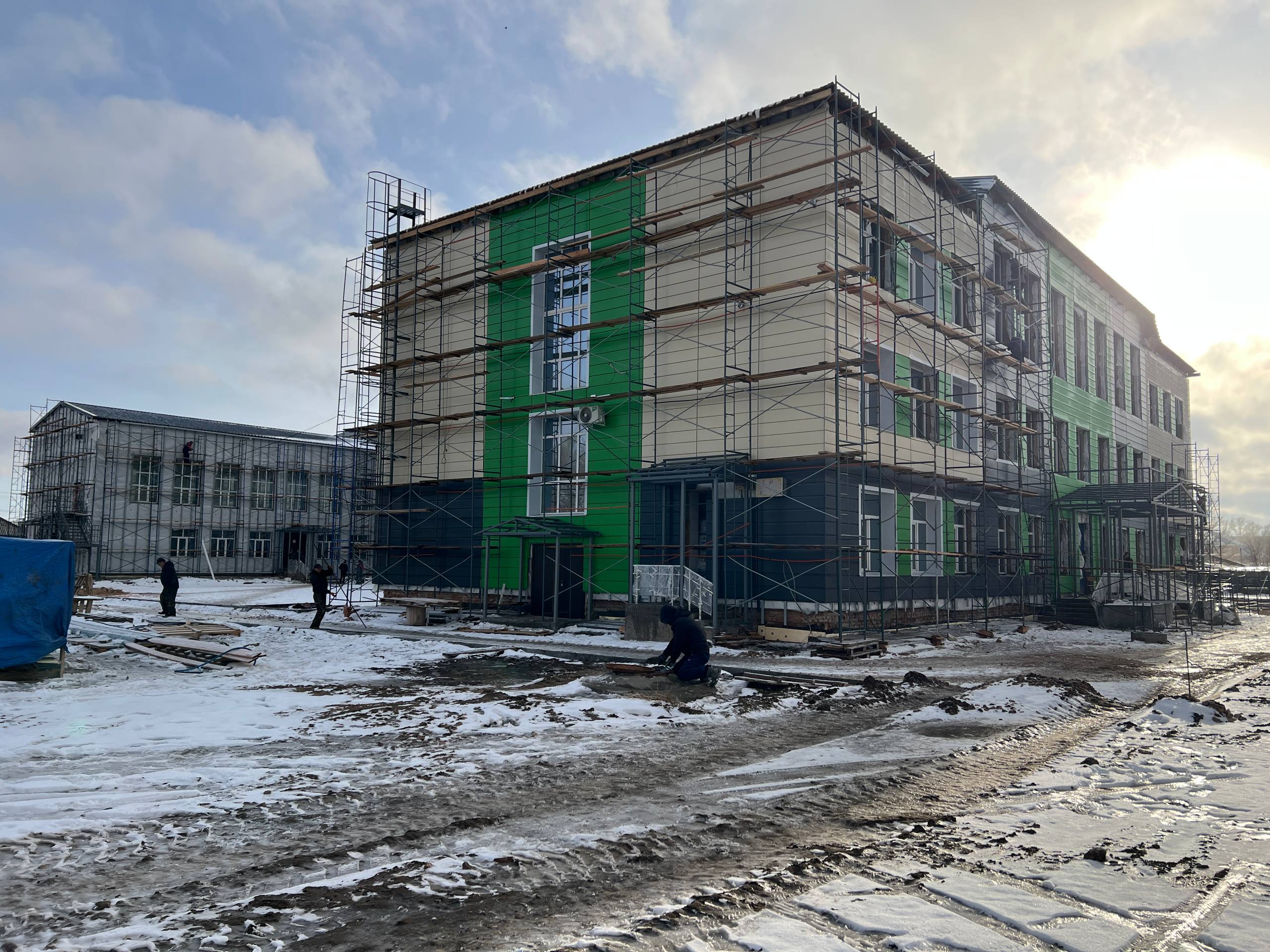 Внутри здания завершаются отделочные работы. На втором и третьем этажах полностью выполнена покраска стен в учебных кабинетах и коридорах. В спортивном зале продолжаются малярные работы, а на первом этаже близится к завершению декоративное оштукатуривание стен. Параллельно ведется прокладка системы отопления, завершаются электромонтажные работы, включая установку светильников, розеток и выключателей, а также ремонт системы водоснабжения. На лестничных клетках активно монтируются новые перила и ограждения.