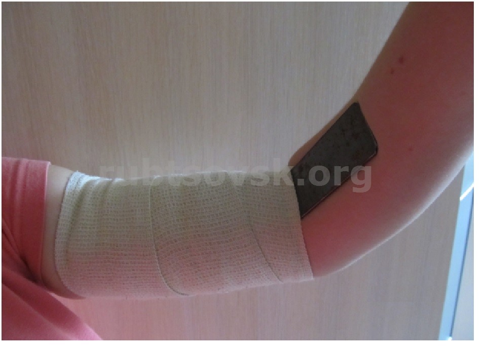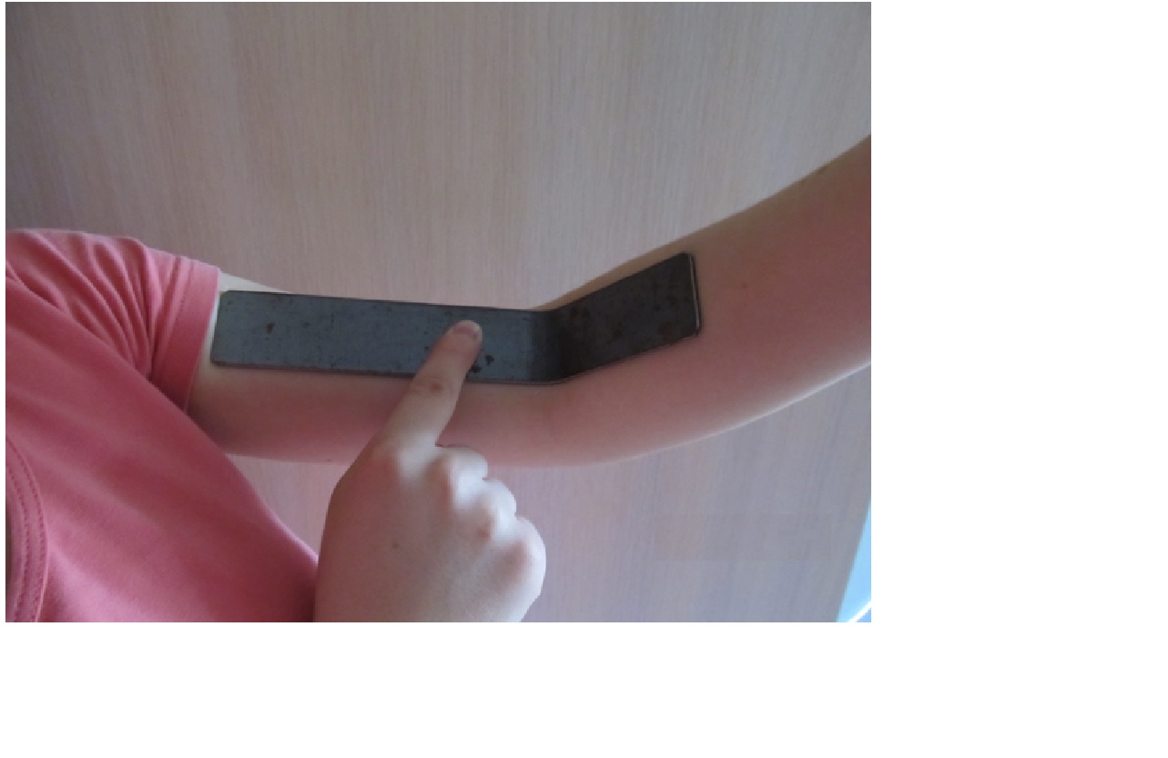Способ предполагает, что во время тренировки к каждой руке занимающегося прикрепляется накладка, в виде изогнутой прямоугольной пластины (см. фото). Эта пластина накладывается на плечо, локтевой сустав и предплечье и фиксируется на плече при помощи эластичного бинта, ремня или другим способом. На предплечье пластина не фиксируется, позволяя руке полностью разгибаться, но ограничивая величину сгибания руки. Материалом для пластин может служить сталь, или другие материалы, удовлетворяющие по своим свойствам назначению накладок.