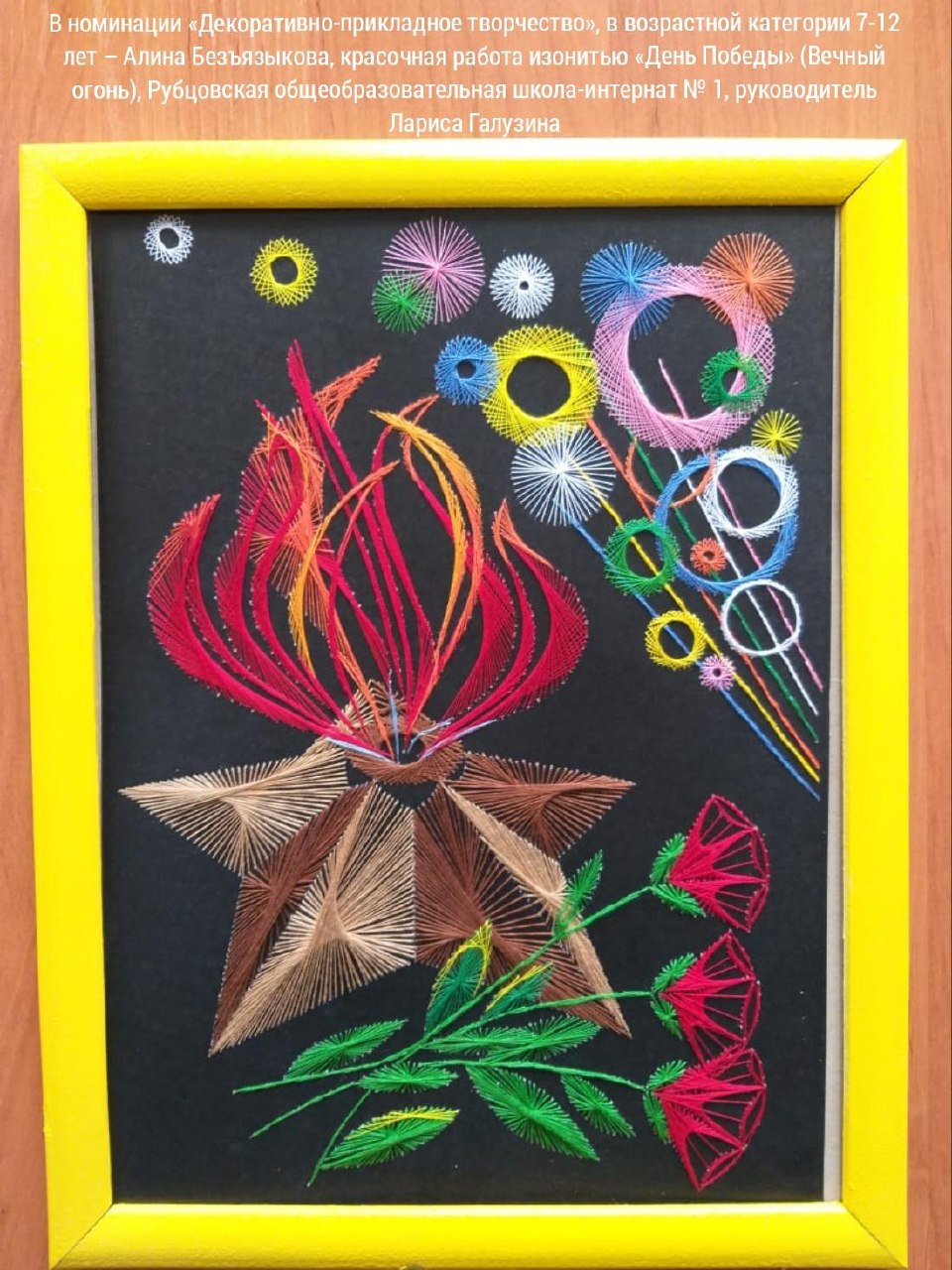 В номинации «Декоративно-прикладное творчество» - Алина Безъязыкова с красочная работа изонитью «День Победы» (Вечный огонь), руководитель Лариса Галузина.