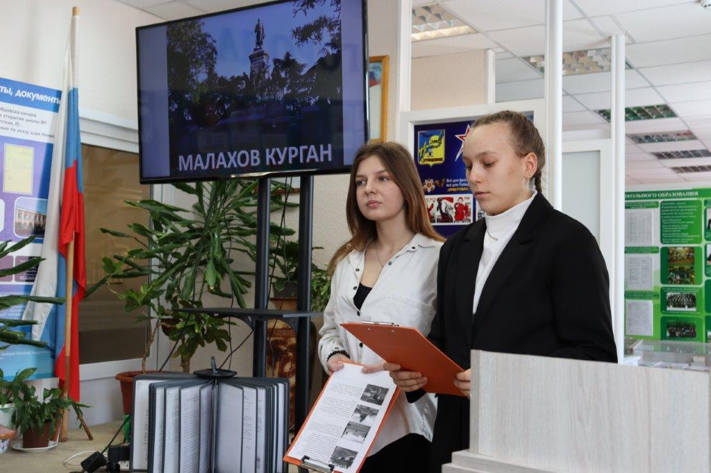 Школьники подготовили сообщения о защите Севастополя. Так, учащиеся лицея №7 рассказали о боях на Сапун-горе, где сегодня возвышается обелиск Славы и создан мемориальный комплекс, увековечившие память героев-освободителей Севастополя. Представители лицея №24 поведали о героической обороне Малахова кургана, а также его талисмане, которым стал обожженный миндаль – единственное уцелевшее дерево на выжженной земле.