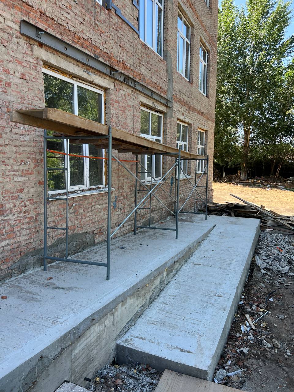 Подрядчик уже залил ступеньки центрального входа и оборудовал пандус для удобства доступа. Завершены подготовительные работы для монтажа новой вентиляционной системы.