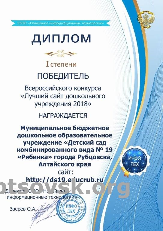 МБДОУ "Детский сад № 19 "Рябинка" участвовал во всероссийском конкурсе "Лучший сайт дошкольного образовательного учреждения 2018" 3 апреля 2018 были определены Победители и лауреаты конкурса. МБДОУ "Детский сад № 19 "Рябинка" стал победителем конкурса в номинации "Лучший сайт дошкольной организации 2018".