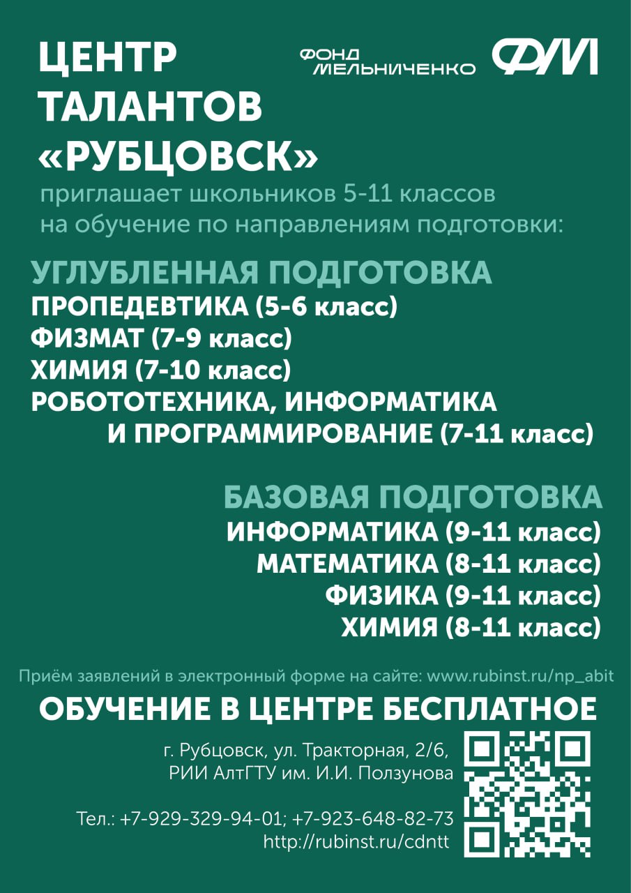 Центр талантов Фонда Мельниченко «Рубцовск» (Рубцовский филиал ЦДНИТТ «Наследники Ползунова», созданный на базе РИИ АлтГТУ) напоминает: прием заявлений на новый учебный год заканчивается 18 мая. Деятельность Центра направлена на углубленное изучение естественнонаучных дисциплин и развитие потенциала одаренных детей. Занятия в Центре талантов «Рубцовск» бесплатные.