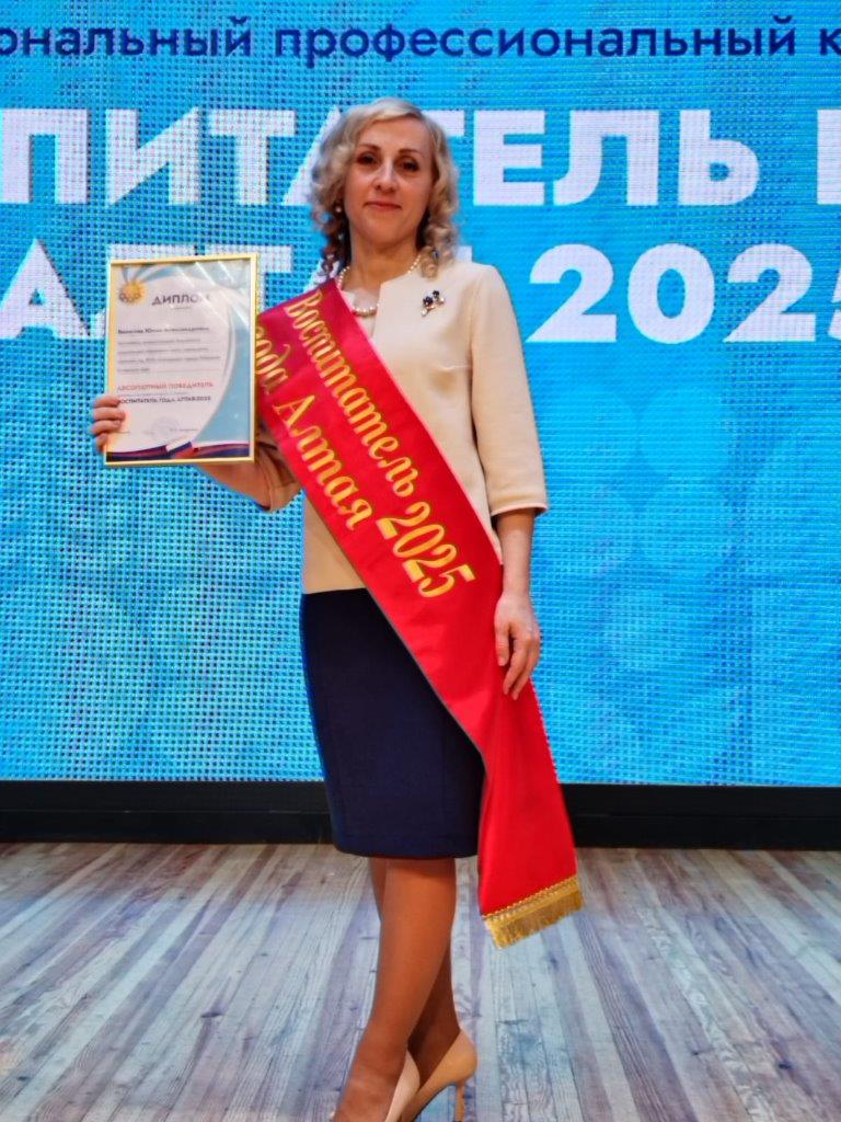25 апреля в Алтайском крае состоялось торжественное награждение победителей и лауреатов регионального профессионального конкурса «Воспитатель года – 2025». По итогам испытаний, которые на протяжении недели выполняли конкурсанты, победителем признана Юлия Волегова, воспитатель детского сада №24 «Солнышко» города Рубцовска. Приз ей вручили Заместитель Председателя Правительства Алтайского края Юрий Абдуллаев и абсолютный победитель конкурса «Воспитатель года Алтая – 2024» Юлия Санкина, инструктор по физической культуре детского сада № 3 «Чебурашка» Косихинского района.