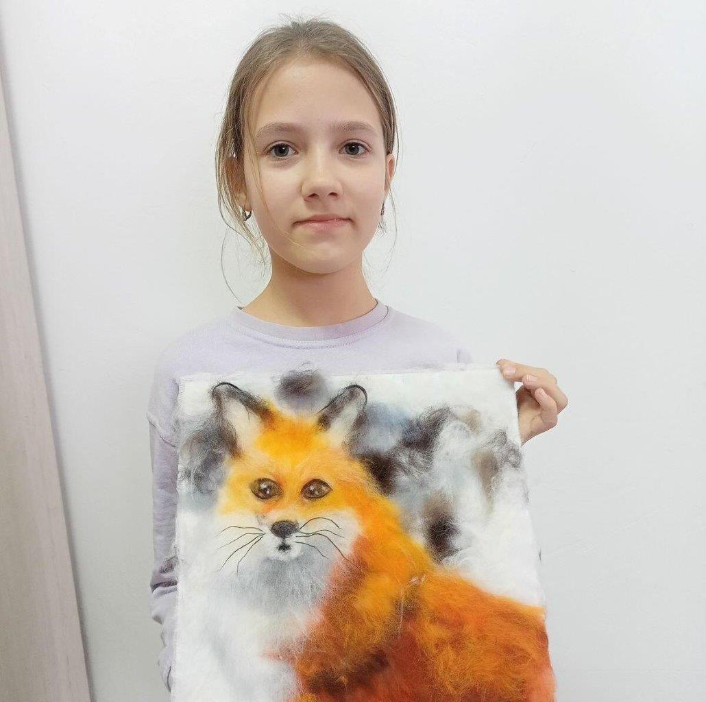 Среди огромного числа работ в возрастной категории 8-12 лет была отмечена картина десятилетней Валерии Данилкиной из Рубцовска, выполненная в технике живописи шерстью.