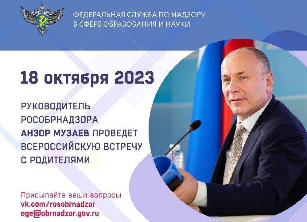 18 октября руководитель Федеральной службы по надзору в сфере образования и науки Анзор Музаев проведет традиционную ежегодную Всероссийскую встречу с родителями.