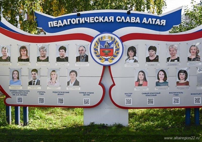 В рамках Большой учительской недели и Дня учителя на Доске почета «Педагогическая слава Алтая», расположенной в сквере Алтайского института развития образования им. А. М. Топорова, разместили портреты 17 педагогов Алтайского края, сообщается на сайте Министерства образования и науки.