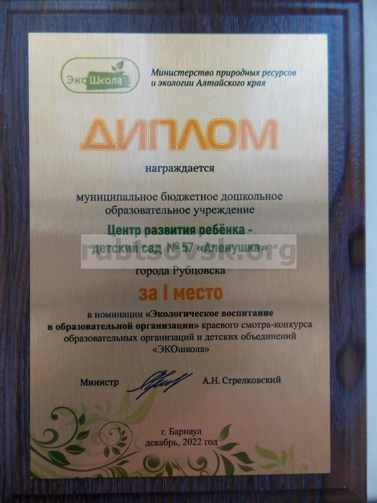 21 декабря в КГБУ ДО «Алтайский краевой детский экологический центр» состоялась торжественная церемония награждения победителей краевых конкурсов по естественнонаучному направлению по итогам 2022 года в рамках краевого форума образовательных организаций, детских объединений и юных талантов «Экология. Творчество. Успех». МБДОУ «Детский сад № 57 «Аленушка» признали победителем краевого смотра-конкурса образовательных организаций и детских объединений «ЭКОшкола» в номинации«Экологическое воспитание в образовательной организации».