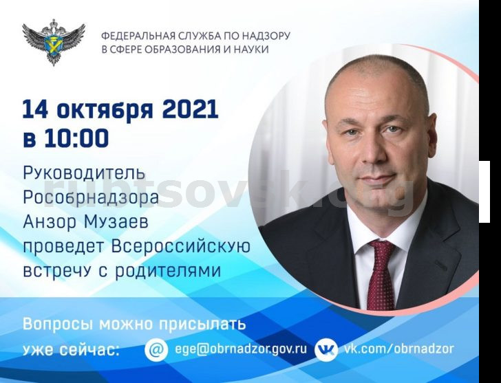 Всероссийская встреча с родителями руководителя Федеральной службы по надзору в сфере образования и науки Анзора Музаева пройдет 14 октября 2021 года в 10:00 (время московское).