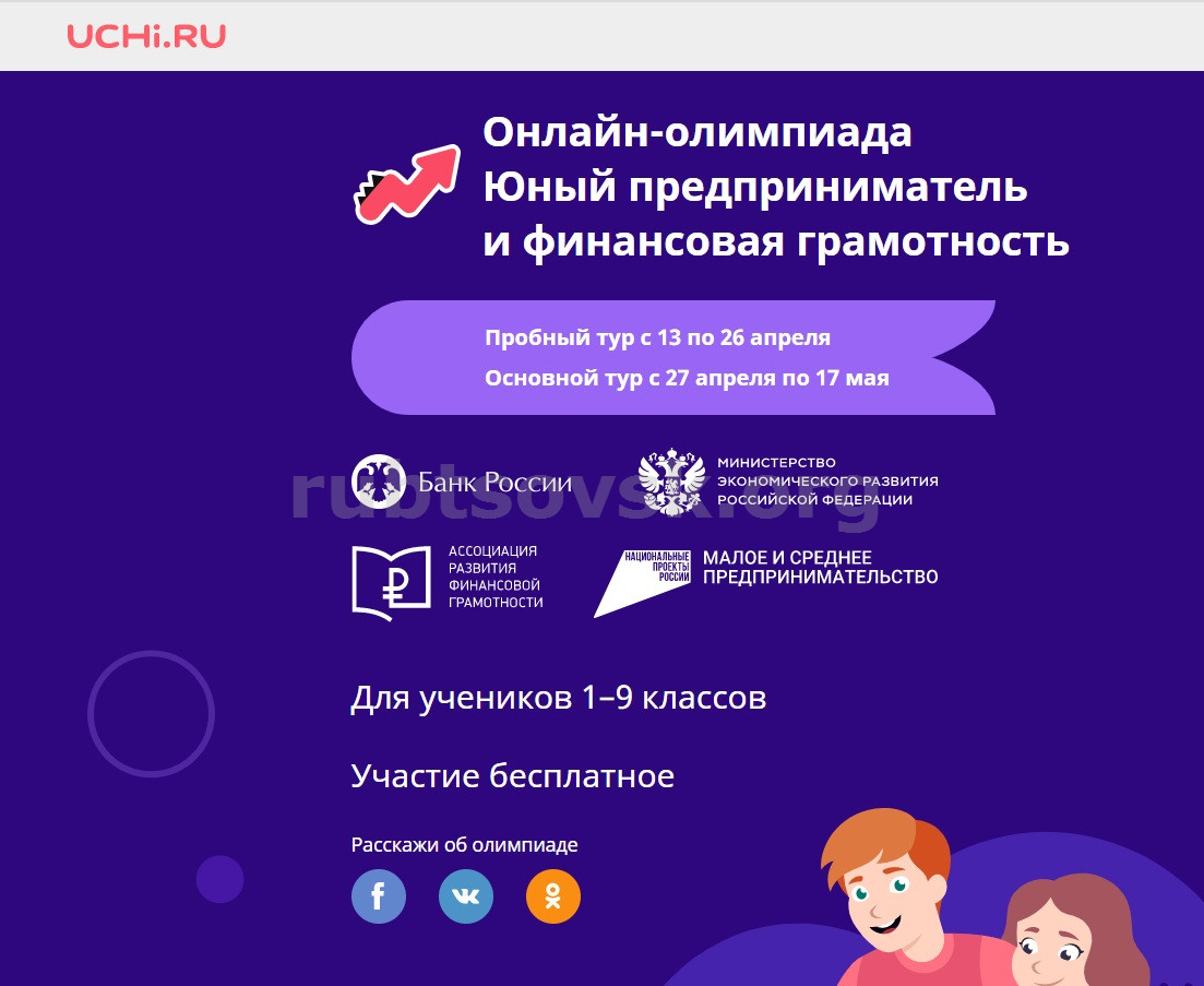Олимпиада «Юный предприниматель и финансовая грамотность» реализуется образовательной онлайн-платформой Учи.ру, на которой зарегистрировано более 8 миллионов учеников со всей России, при поддержке национального проекта «Малое и среднее предпринимательство и поддержка индивидуальной предпринимательской инициативы», Министерства экономического развития РФ, Центрального банка РФ и Ассоциации развития финансовой грамотности.