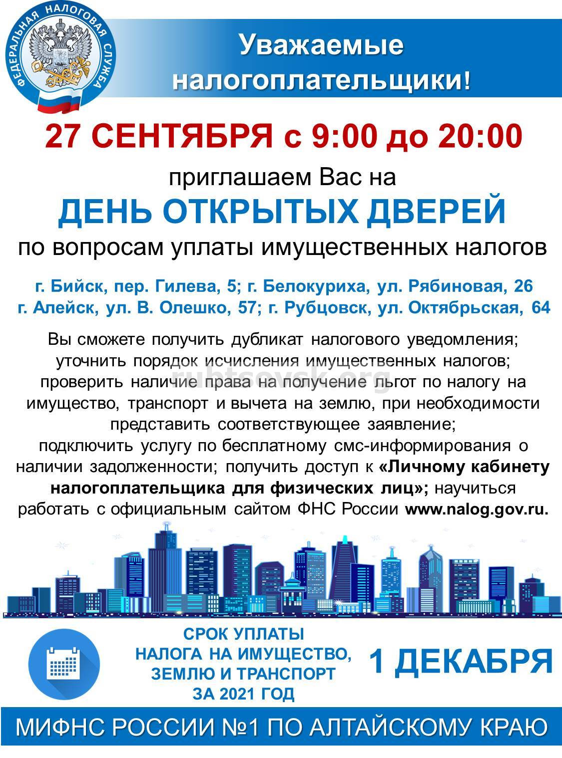 День открытых дверей для налогоплательщиков – физических лиц пройдет 27 сентября с 9:00 до 20:00 по адресу: г. Рубцовск, ул. Октябрьская, 64.