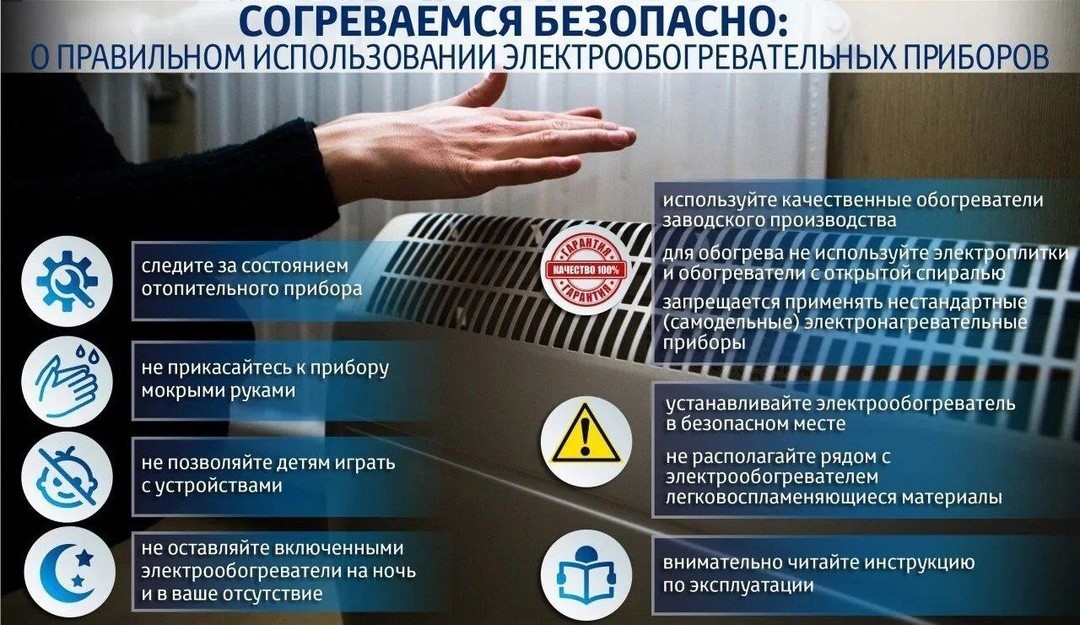 Используйте только сертифицированное оборудование заводского производства. Категорически запрещается применение самодельных электронагревательных устройств. Не допускайте перегрузки электросети одновременным включением нескольких мощных приборов.