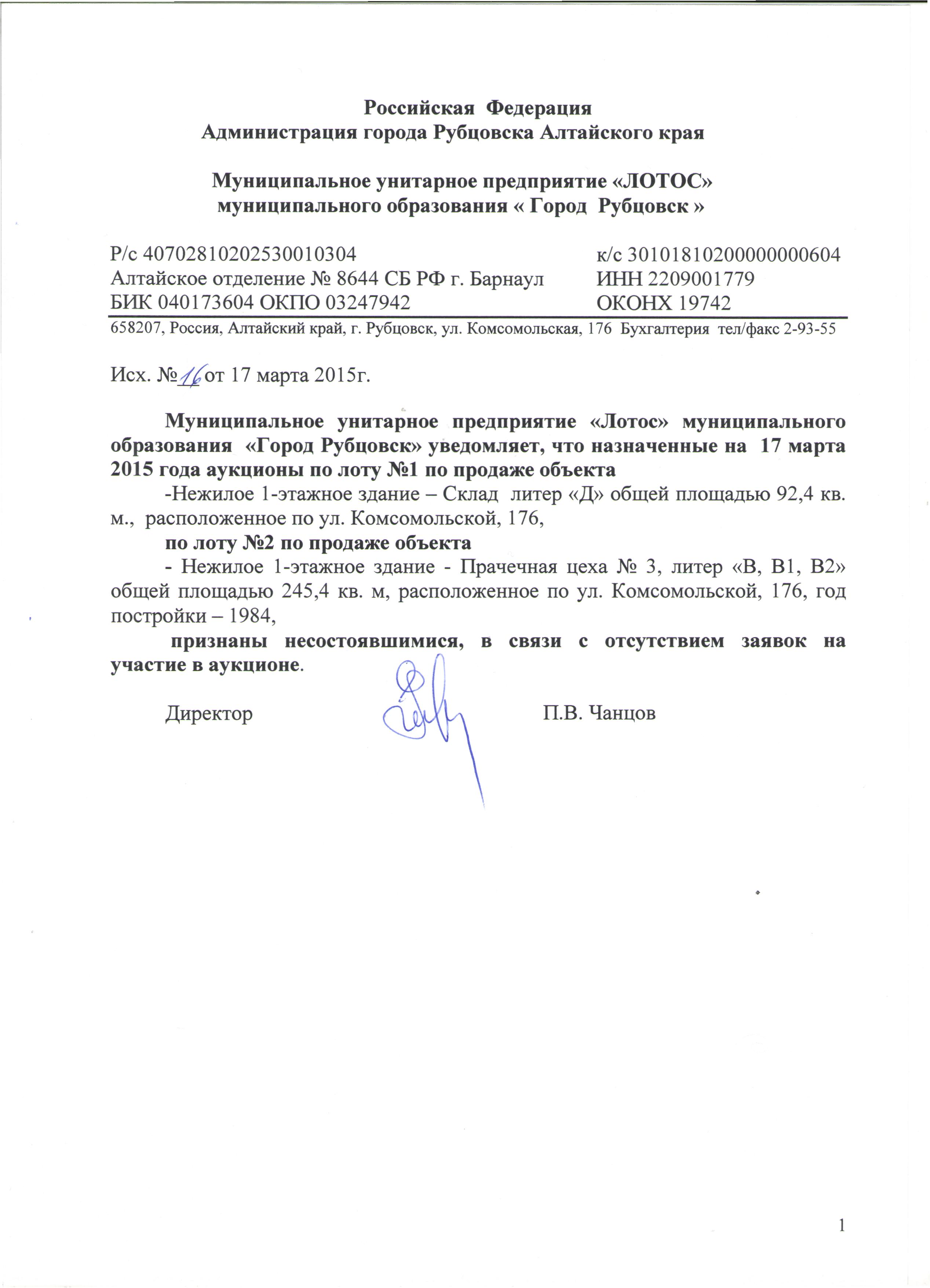 Аукцион (открытая форма подачи предложений о цене) по продаже нежилого здания склада МУП «Лотос» по ул.Комсомольской,176 в г.Рубцовске, 17 марта 2015 года в 10 часов