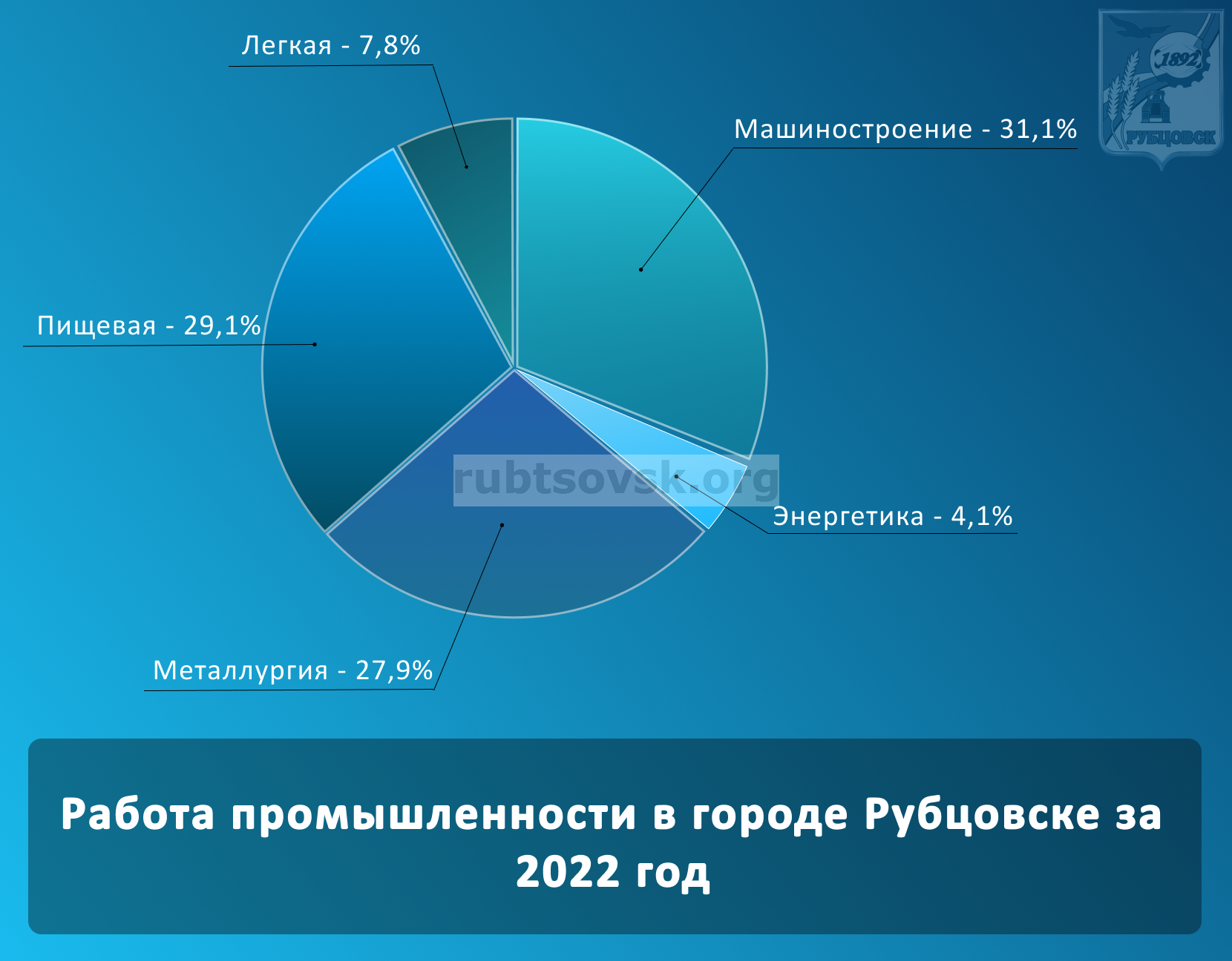 Согласно оперативной информации, представленной крупными и средними промышленными предприятиями Рубцовска, за январь 2024 года промышленными предприятиями города произведено продукции на сумму 2,8 миллиардов рублей. Объём отгруженной товарной продукции в январе 2024 года вырос по отношению к 2023 году (в сопоставимых ценах) на 16,6 % и составил более 3 миллиардов рублей. Доля объемов реализации по отраслям в общем продукте за январь 2024 года представлена в диаграмме, с которой можно ознакомиться ниже в прикрепленном файле.
