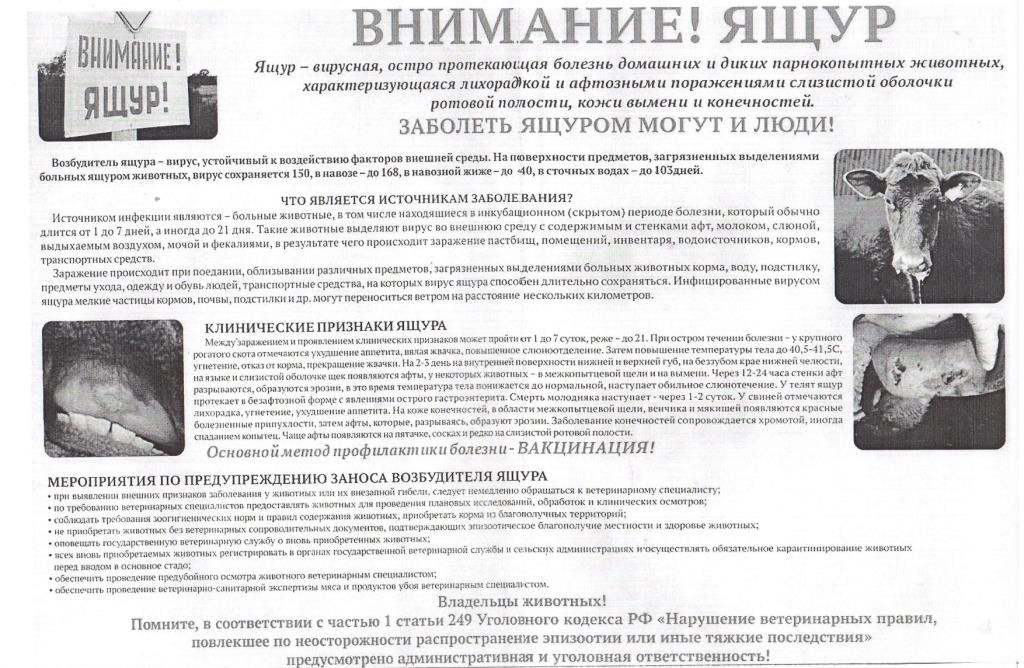 Ящур – вирусная, остро протекающая болезнь домашних и диких парнокопытных животных, характеризующаяся лихорадкой и афтозными поражениями слизистой оболочки ротовой полости, кожи вымени и конечностей. Чаще всего болеют крупный рогатый скот и свиньи, менее восприимчивы овцы, козы и дикие парнокопытные. Молодые животные более восприимчивы и переболевают тяжелее, чем взрослые. Заболеть ящуром могут и люди. Источник болезни – больные животные, в том числе находящиеся в инкубационном (скрытом) периоде болезни, который обычно длится от 1 до 7 дней, а иногда до 21 дня.