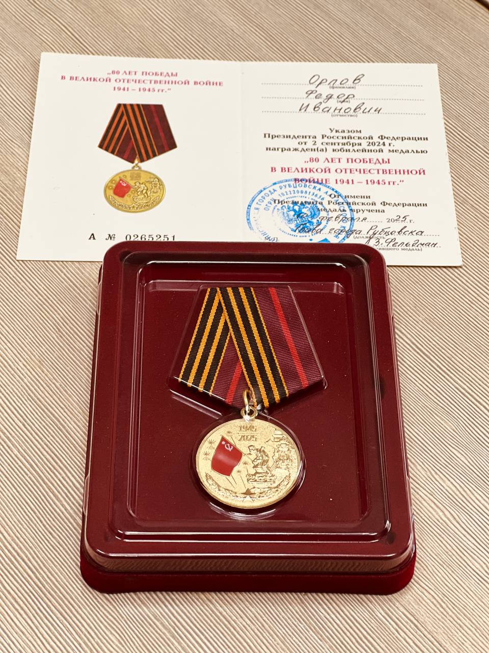 Почётные гости вручили юбиляру поздравительные телеграммы с юбилейным днем рождения от Президента Российской Федерации, Правительства Алтайского края, памятные подарки. А также указом Президента Российской Федерации Владимира Путина Федор Иванович был награжден юбилейной медалью «80 лет Победы в Великой Отечественной войне 1941 – 1945 гг.», и сегодня Дмитрий Фельдман вручил медаль ветерану.
