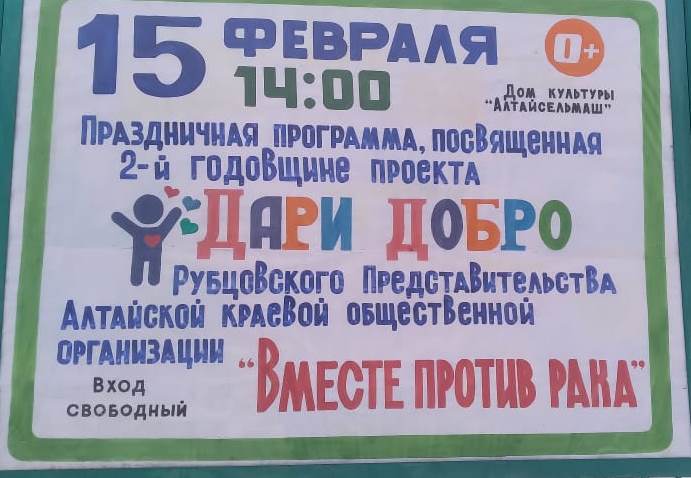 15 февраля в 14:00 в ДК «Алтайсельмаш» состоится праздничная программа, посвящённая 2-й годовщине проекта «Дари добро», который реализуется Рубцовским представительством АКОО «Вместе против рака».