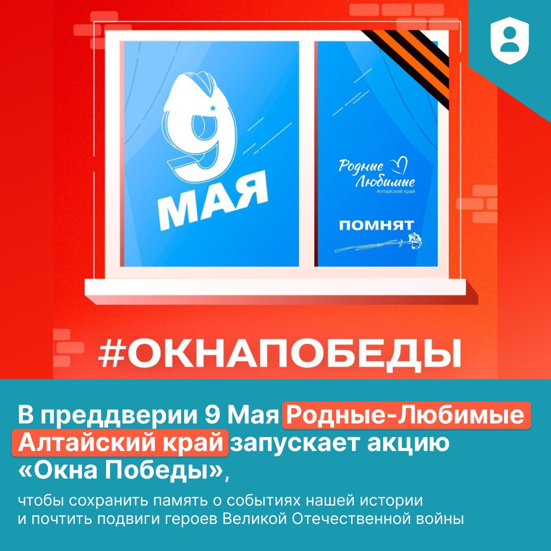 В преддверии 9 Мая «Родные-Любимые. Алтайский край» запускает акцию «Окна Победы», чтобы сохранить память о событиях нашей истории и почтить подвиги героев Великой Отечественной войны. Присоединиться к акции можно в ВКонтакте «Окна Победы» по ссылке: vk.com/wall-222979709_1975