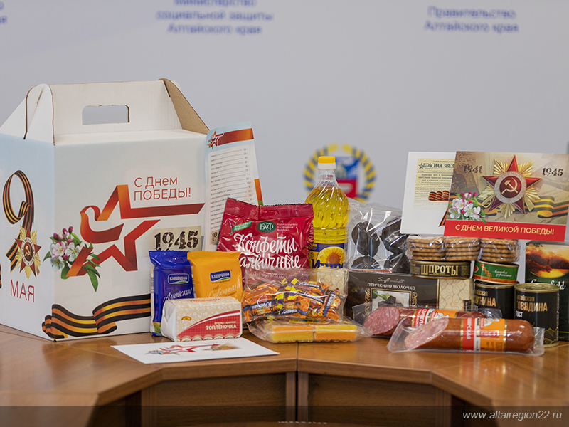 К 79-й годовщине Победы в регионе подготовлен 381 подарок. Его получат ветераны Великой Отечественной войны - инвалиды и участники войны, награжденные знаком «Жителю блокадного Ленинграда» и бывшие несовершеннолетние узники концлагерей, сообщили в Правительстве Алтайского края. В этом году праздничный стол ветеранов украсит продуктовый набор из 18 наименований. Состав набора обсуждался с ветеранскими организациями и сформирован в основном из продуктов алтайских производителей. Это сервелат, мясные консервы, алтайские сыры, растительное масло, конфеты, печенье, зефир и мармелад, халва и т. д.