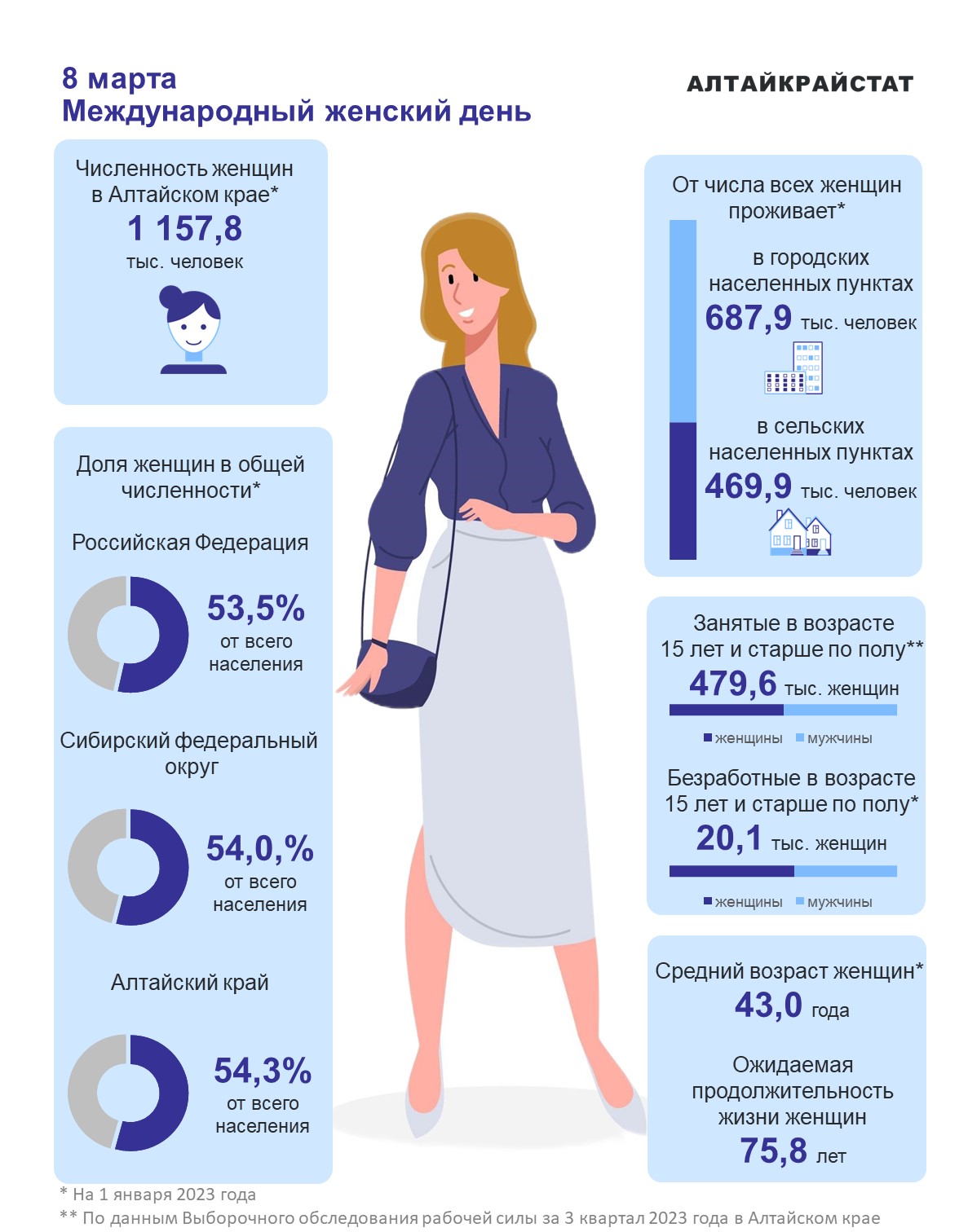Международный женский день – праздник, который отмечается ежегодно 8 марта в ряде государств и стран мира. Алтайкрайстат подготовил информацию о женщинах Алтайского края. Численность женщин в Алтайском крае на 1 января 2023 года составляла 1157,8 тысяч человек. Доля женщин в общей численности населения: Российская Федерация – 53,5%; Сибирский федеральный округ – 54,0%; Алтайский край – 54,3%.