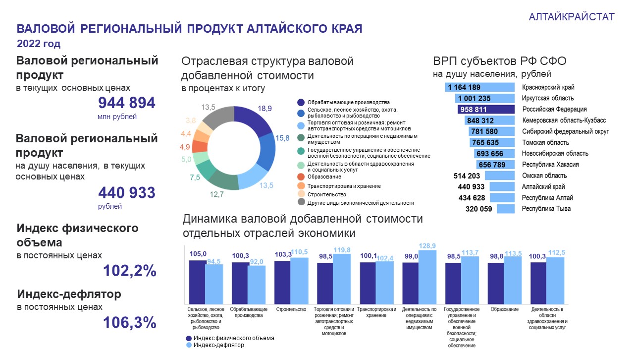Номинальный объем произведенного валового регионального продукта (ВРП) Алтайского края в текущих основных ценах в 2022 году сложился в размере 944,9 млрд рублей. Индекс физического объема ВРП составил 102,2% относительно 2021 года, индекс-дефлятор – 106,3%. Доля региона в ВРП РФ составила 0,7%, в ВРП СФО – 7,2%. На душу населения произведенный ВРП в 2022 г. увеличился на 40,9 тыс. рублей и достиг 440,9 тыс. рублей (в 2021 году – 400,0 тыс. рублей), что соответствует 8 месту из числа регионов СФО.