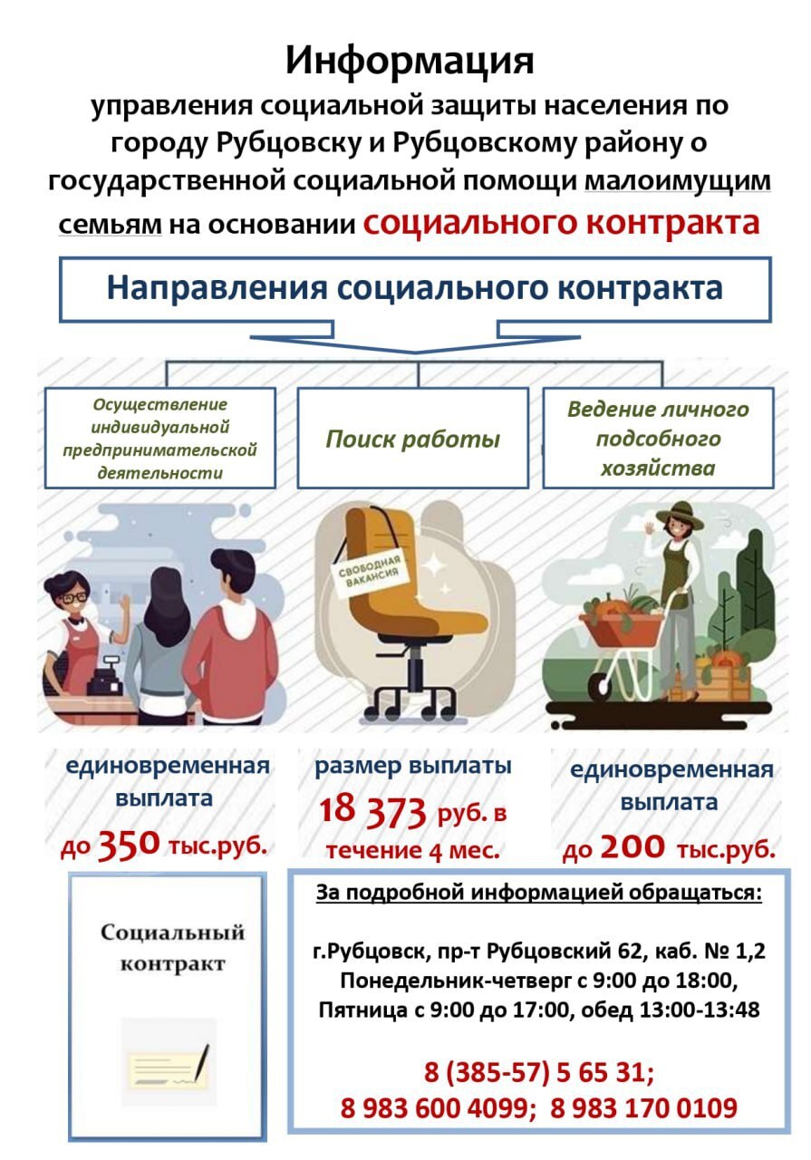 В Рубцовске начался приём заявлений на оказание материальной помощи на основании социального контракта. Это отличная возможность для улучшения финансового положения и реализации бизнес - планов.