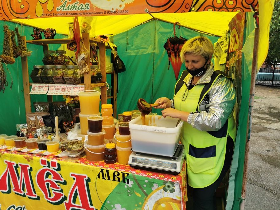 22 августа в Рубцовске начала работать долгожданная ярмарка меда. Обычно она начиналась раньше – на Медовый Спас, но в этом году свои коррективы в уже устоявшиеся традиции внесла пандемия коронавирусной инфекции COVID-19. Да и расположилась ярмарка не на привычном для горожан месте – на площадке у КРЦ «Россия», а в парковом сквере у входа на Центральный рынок со стороны проспекта Ленина. При организации торговли пчеловоды обеспечили выполнение всех санитарных требований: есть информационный стенд, нанесена разметка для соблюдения необходимой социальной дистанции. На столах в каждой палатке есть антисептик для обработки рук, а при необходимости покупателю выдадут одноразовую защитную маску.