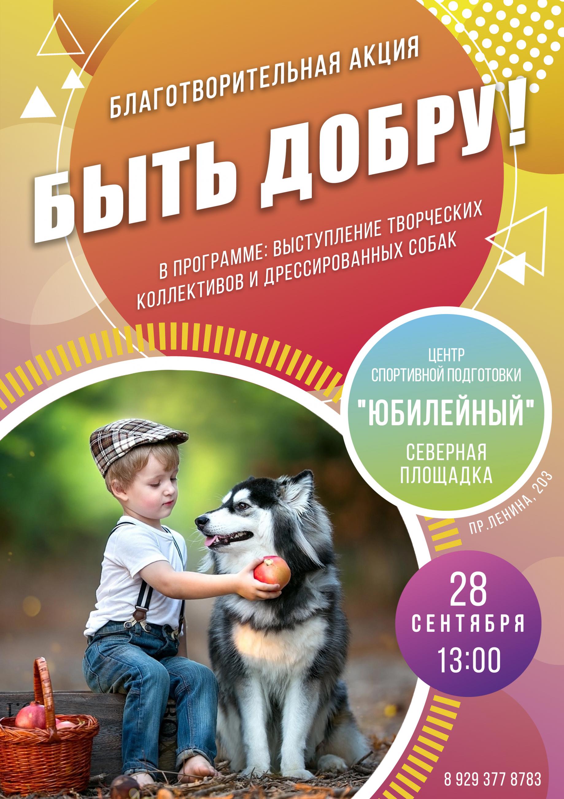 Алтайская краевая общественная организация "Приют для животных "Алиса" совместно с кинологическим клубом "Союз" проводит благотворительную акцию "Быть добру!". Акция приурочена ко всемирному Дню животных. Приглашаем всех 28 сентября в 13 часов в ЦСП "Юбилейный" (северная площадка).
