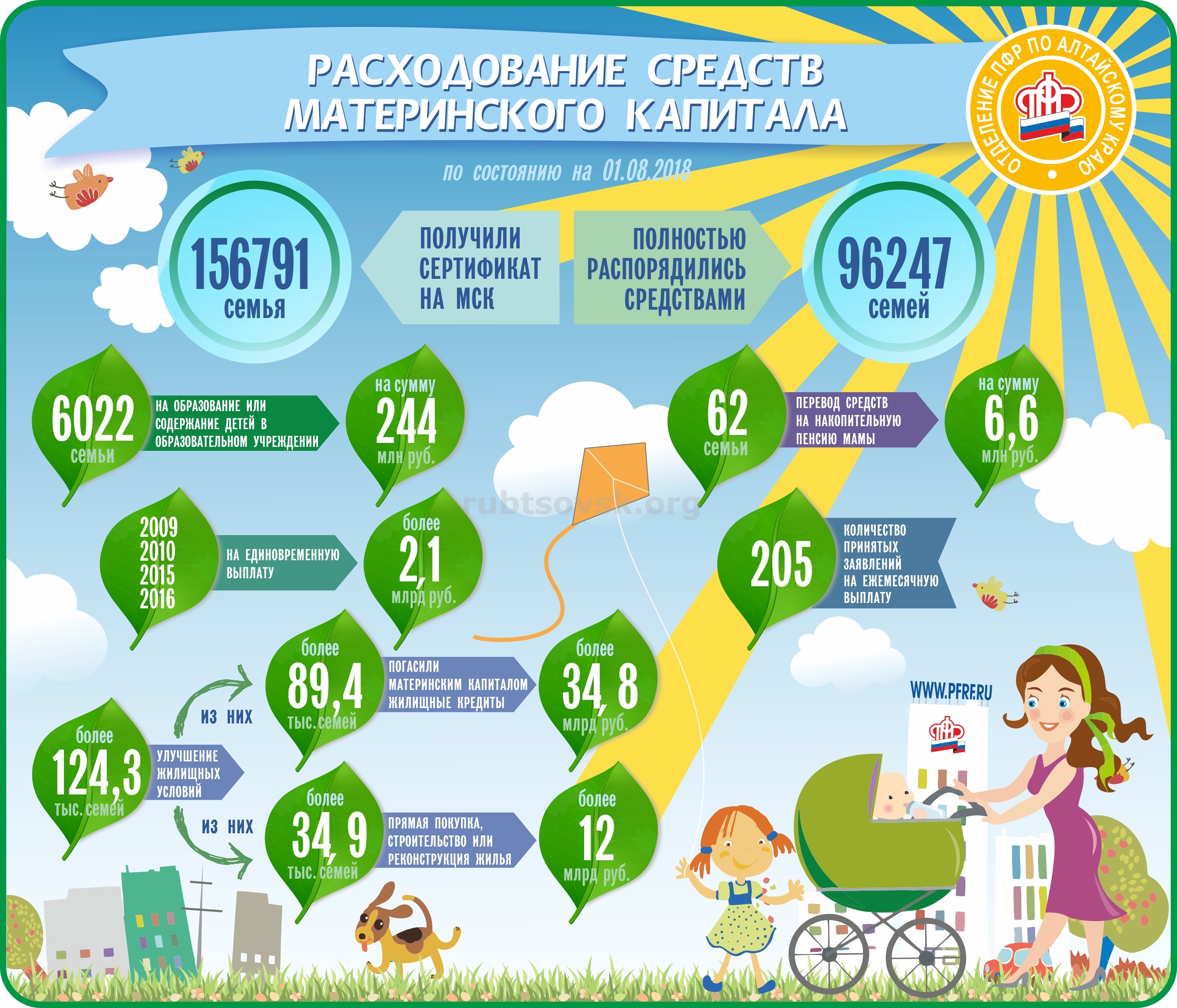 С начала действия программы материнского капитала благодаря его средствам жилищные условия улучшили 124,3 тыс. алтайских семей. Из них 89,4 тыс. семей частично или полностью погасили материнским капиталом жилищные кредиты. Еще 34,9 тыс. семей улучшили жилищные условия без привлечения кредитных средств. По-прежнему жилищные вопросы остаются главной статьей расходов по материнскому капиталу среди алтайских семей.