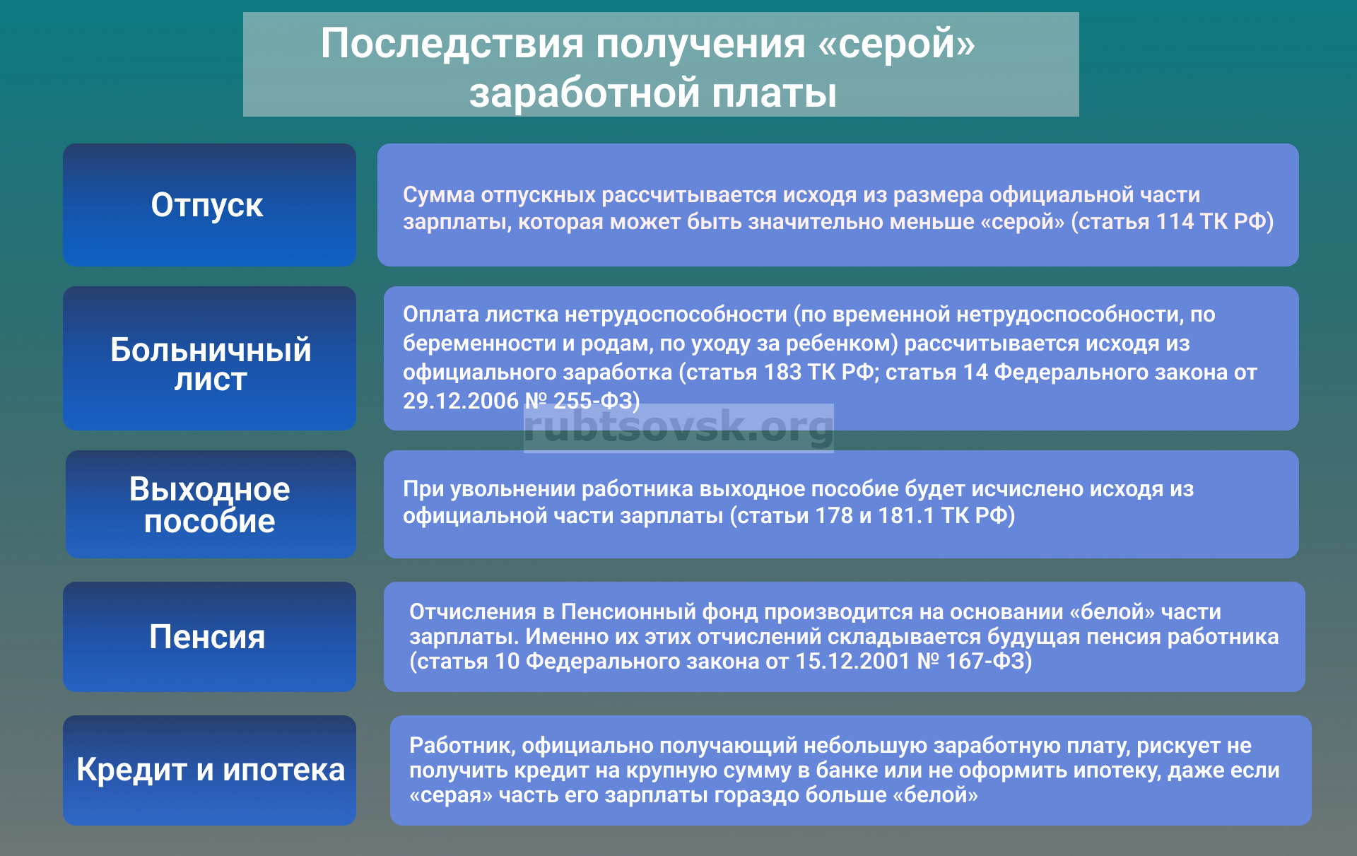 Обращаем внимание: выплата «серой» заработной платы производится исключительно по воле работодателя на страх и риск работника, размер, порядок и срок выплаты не закреплены никакими документами, поэтому такие выплаты в любой момент могут прекратиться.
