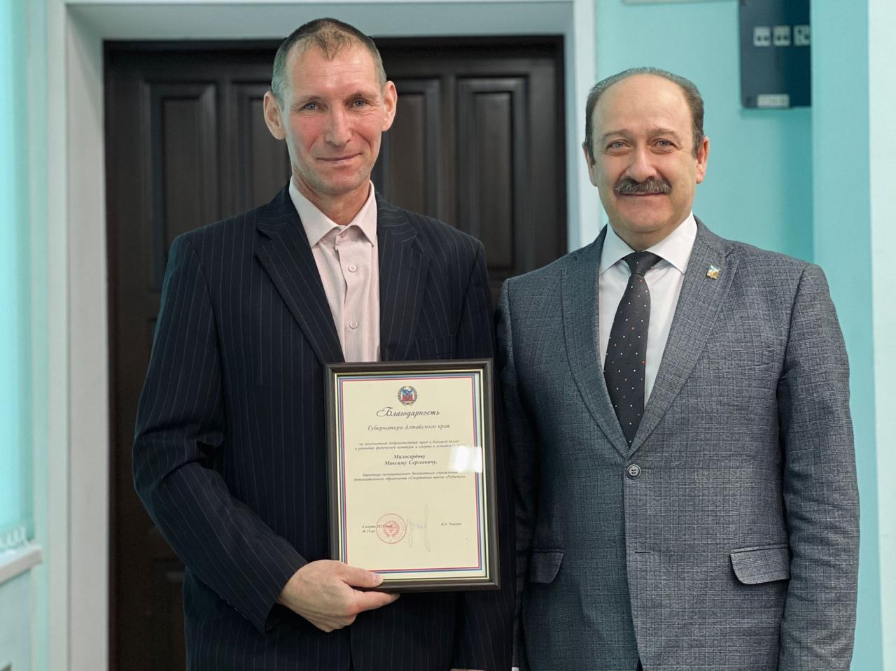 Благодарностью Губернатора Алтайского края отмечены: тренер-преподаватель СШ «Юбилейный» Елена Полухина, тренер-преподаватель СШ «Юбилейный» Михаил Прищепа, тренер-преподаватель СШ «Спарта» Олег Кузьмин, а также директор СШ «Рубцовск» Максим Милосердов.
