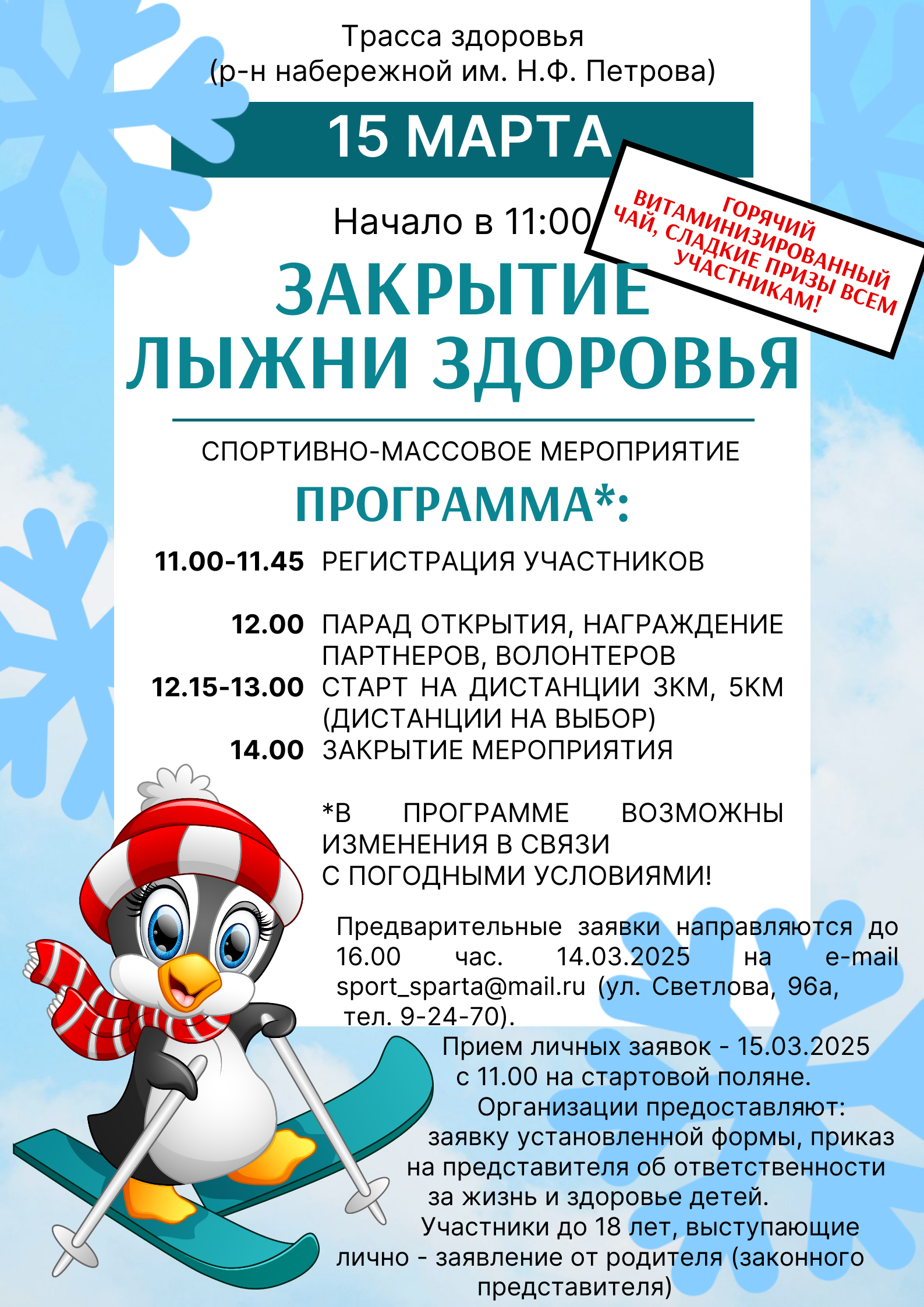 5 марта в 11:00 в районе набережной Н.Ф. Петрова состоится спортивно-массовое мероприятие «Закрытие Лыжни здоровья».