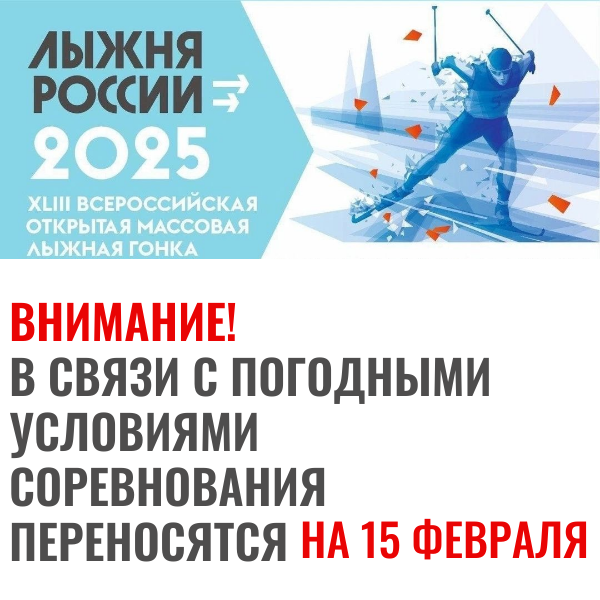 Всероссийская массовая лыжная гонка «Лыжня России-2025», запланированная на 8 февраля, переносится на 15 февраля из-за неблагоприятных погодных условий. Следите за обновлениями и готовьтесь к активному участию! Спасибо за ваше понимание!