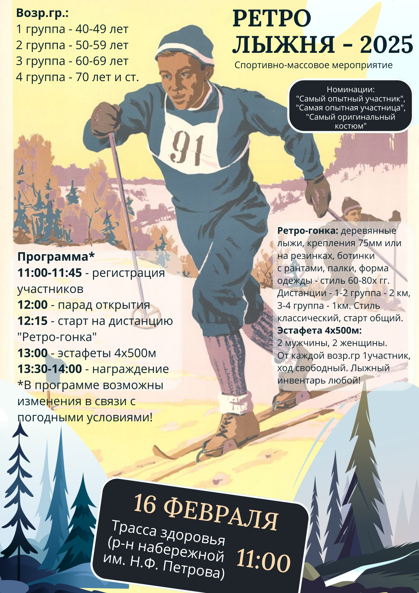 16 февраля в 11:00 на Трассе здоровья в районе набережной имени Н.Ф. Петрова состоится традиционное спортивно-массовое мероприятие «Ретро Лыжня-2025».