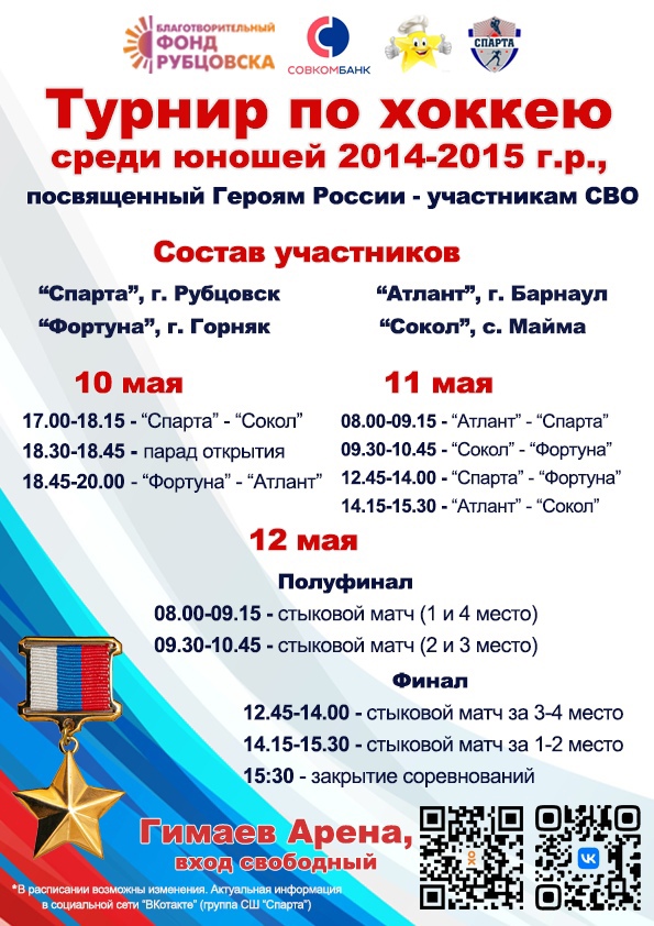 12 мая завершился турнир по хоккею среди юношей 2014-2015 г.р., посвященный Героям России - участникам СВО. В соревнованиях приняли участие четыре команды из Барнаула, Горняка, Маймы, Рубцовска.