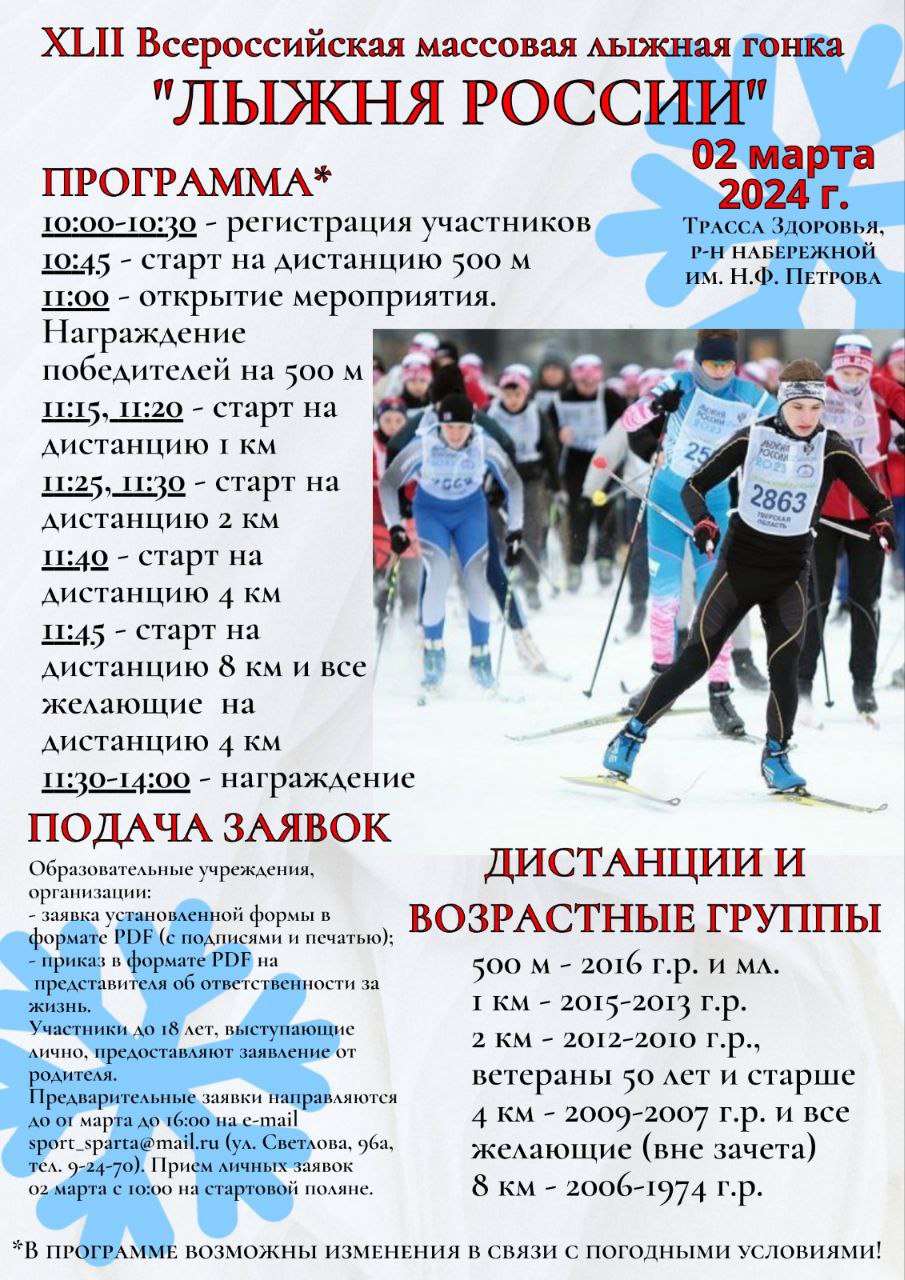 2 марта на трассе на Трассе Здоровья в районе набережной имени Н.Ф. Петрова состоится XLII Всероссийская массовая лыжная гонка «Лыжня России». Регистрация участников начнется в 10:00, старт будет дан в 10:45. В рамках мероприятия пройдут забеги на различные дистанции: 500 метров (для участников 2016 года рождения и младше), 1, 2, 4 и 8 километров.