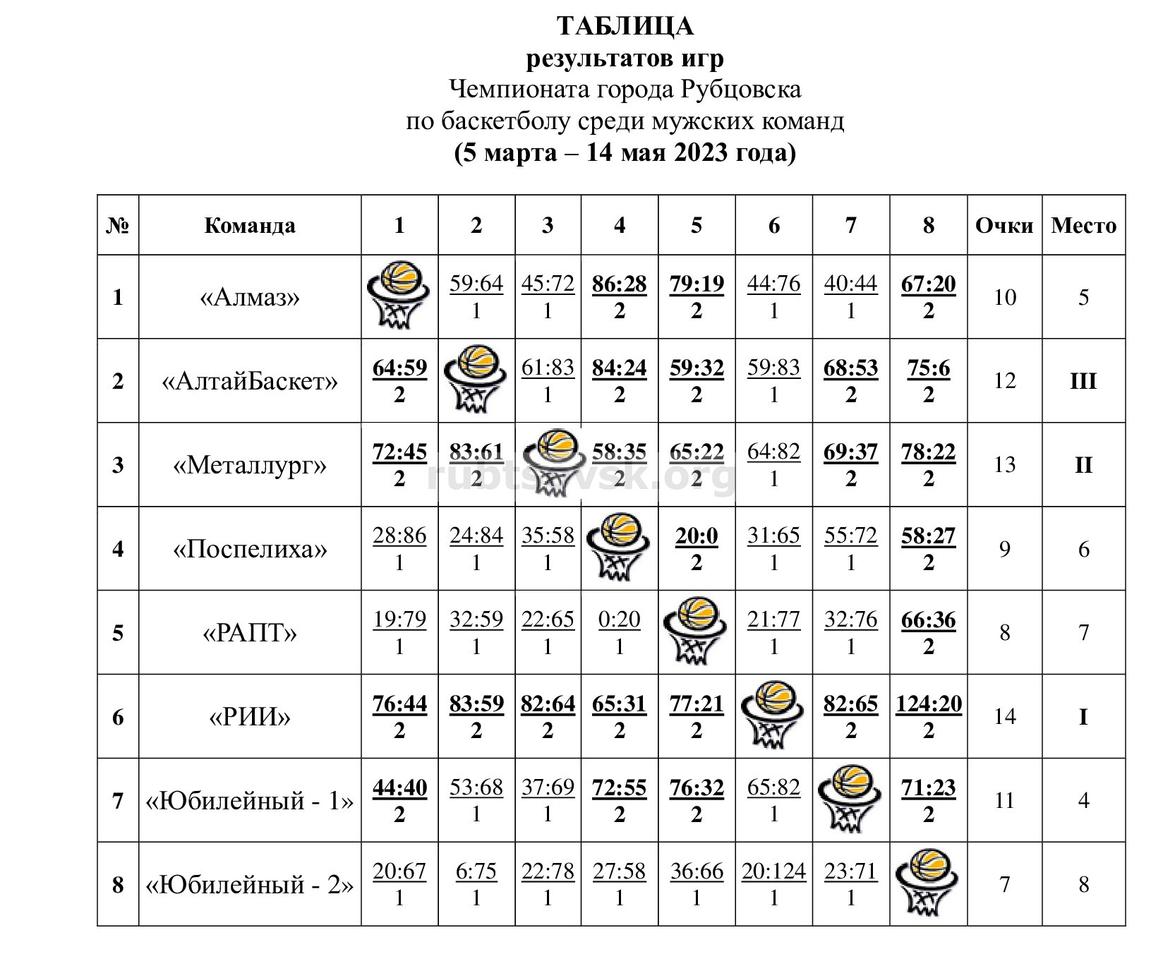 С 5 марта по 14 мая в Рубцовске прошел чемпионат города по баскетболу среди мужчин. В спортивном зале МБУ СП «СШ «Юбилейный», 14 мая, состоялись заключительные игры Чемпионата города Рубцовска по баскетболу среди мужских команд.