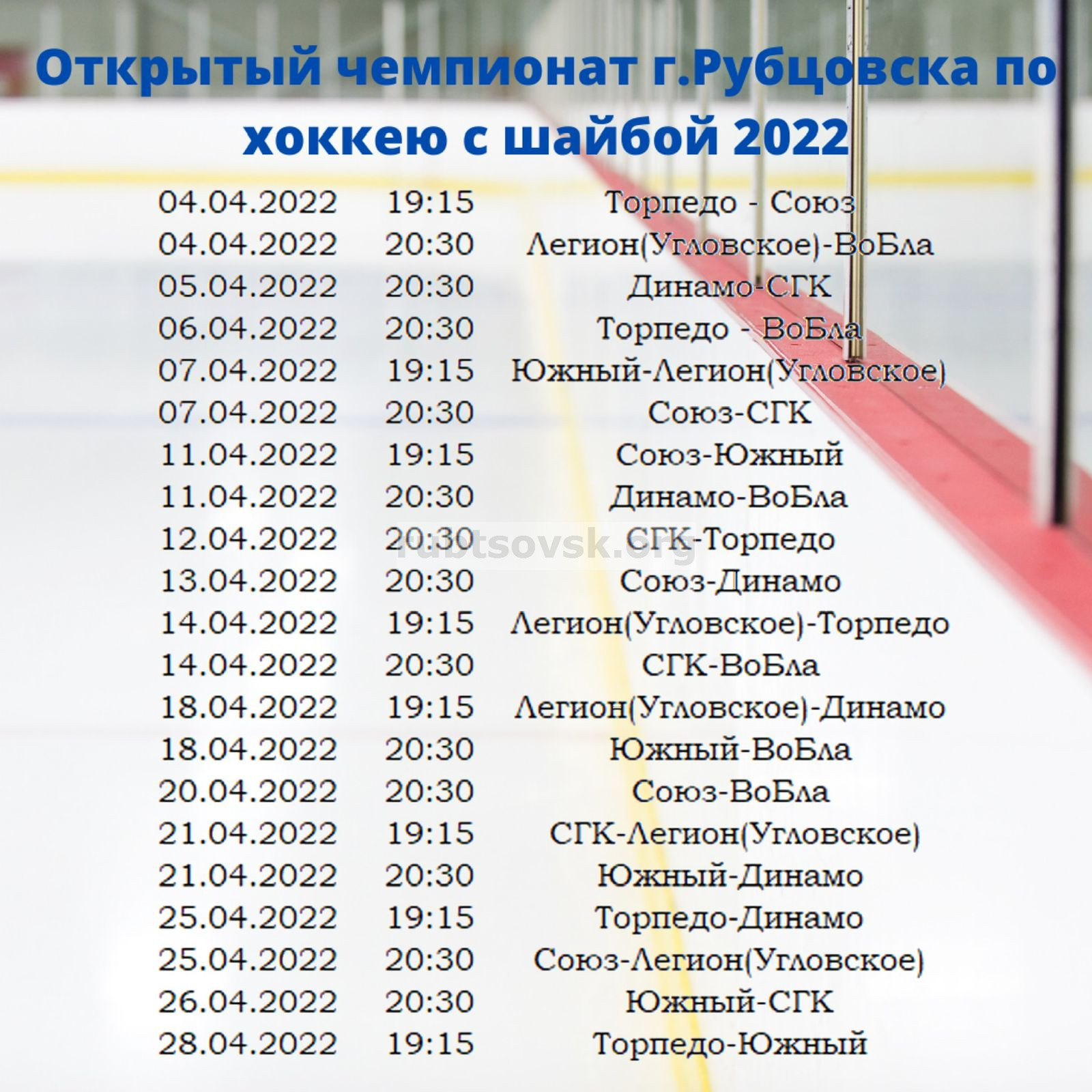 С 4 по 28 апреля 2022 года в городе Рубцовске в ледовом комплексе «Гимаев Арена» проходит открытый чемпионат города Рубцовска по хоккею с шайбой.