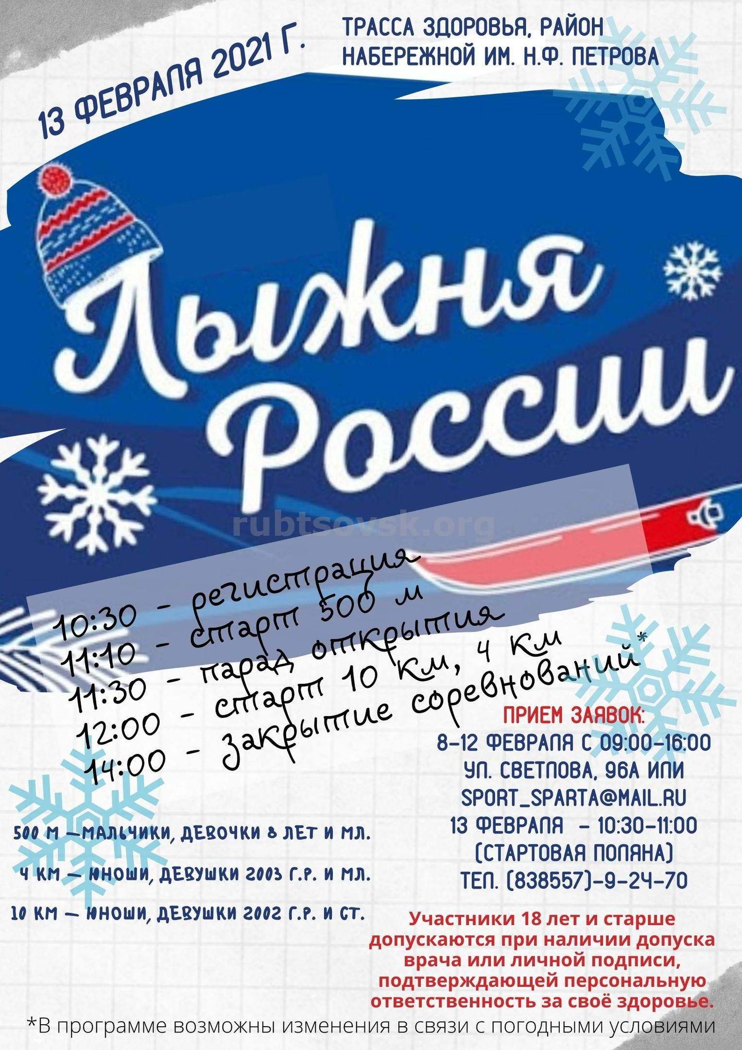 К участию в мероприятии допускаются жители города Рубцовска и близлежащих районов, не имеющие противопоказаний по состоянию здоровья для занятий лыжными гонками.