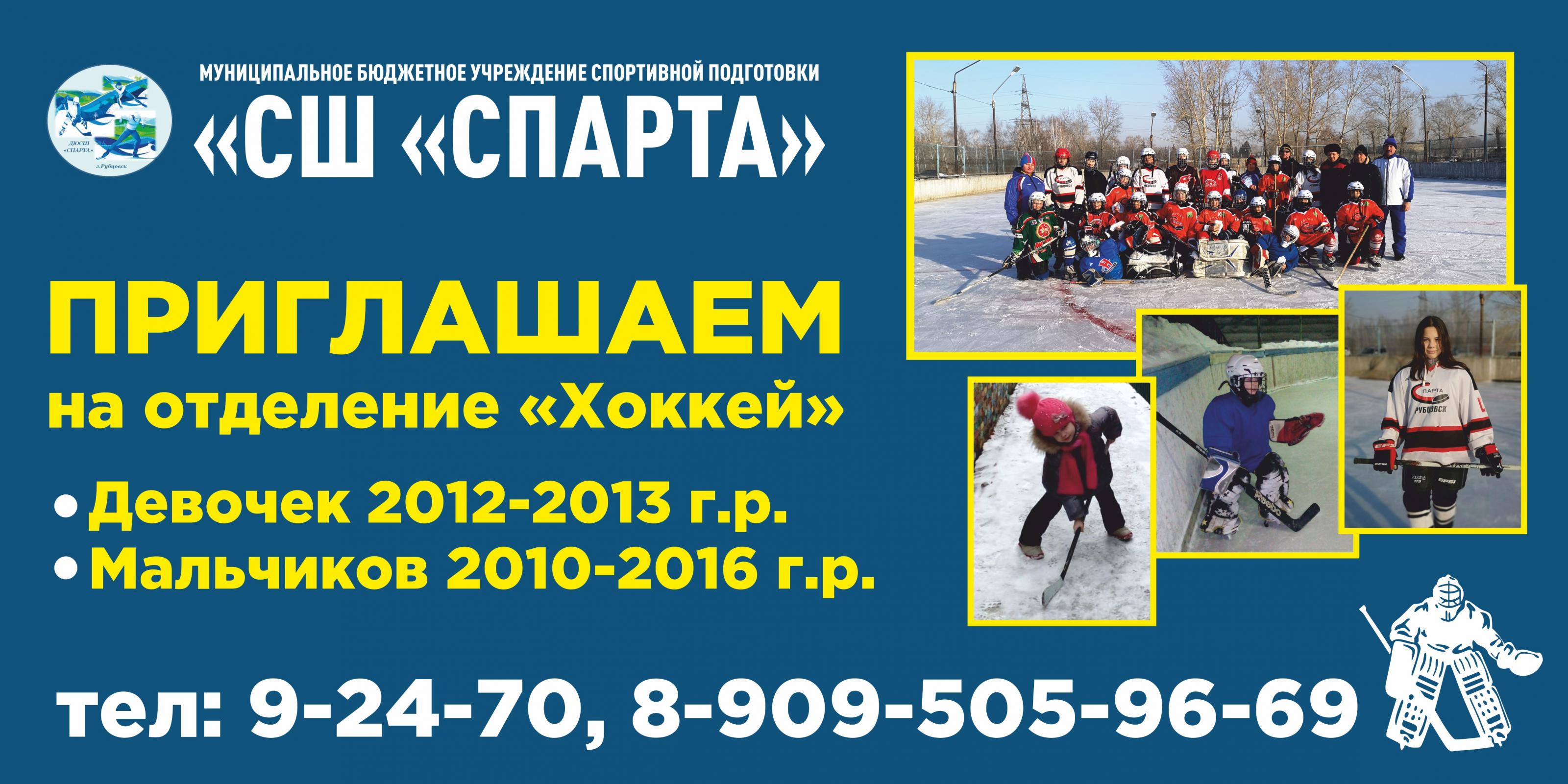 Спортивная школа «Спарта» Рубцовска приглашает юных хоккеистов в нашу дружную команду: девочек 2012-2013 г.р. и мальчиков 2010- 2016 г.р. Интересующие вопросы можно задать по телефонам: 9-24-70, 8-909- 505-96-69.