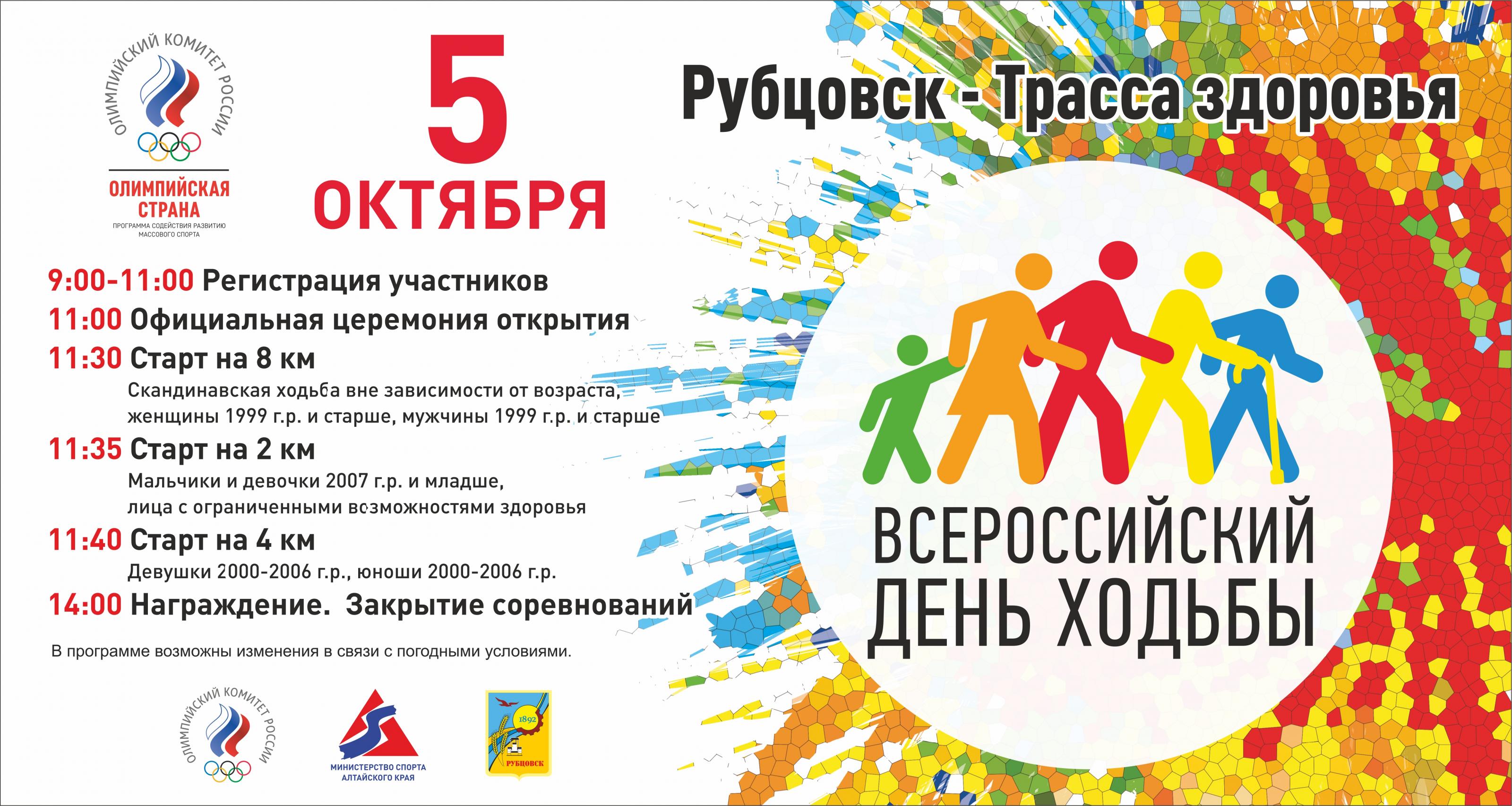5 октября в Рубцовске пройдет Всероссийский день ходьбы. Спортивный праздник состоится на Трассе здоровья (район городской набережной имени Петрова, правый берег Алея). Принять участие в массовом забеге могут все желающие, кому это позволяет сделать здоровье. Представители команд предоставляют в мандатную комиссию следующие документы: