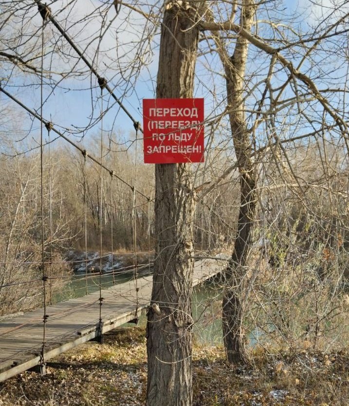 В целях обеспечения безопасности населения дежурная смена поисково-спасательного отряда МКУ «Управление по делам ГОЧС города Рубцовска» проверила сохранность информационных аншлагов «Переход (переезд) по льду запрещен» ранее установленных на реке Алей в черте города, а также наличие и толщину ледяного покрова (ледяной покров отсутствует).