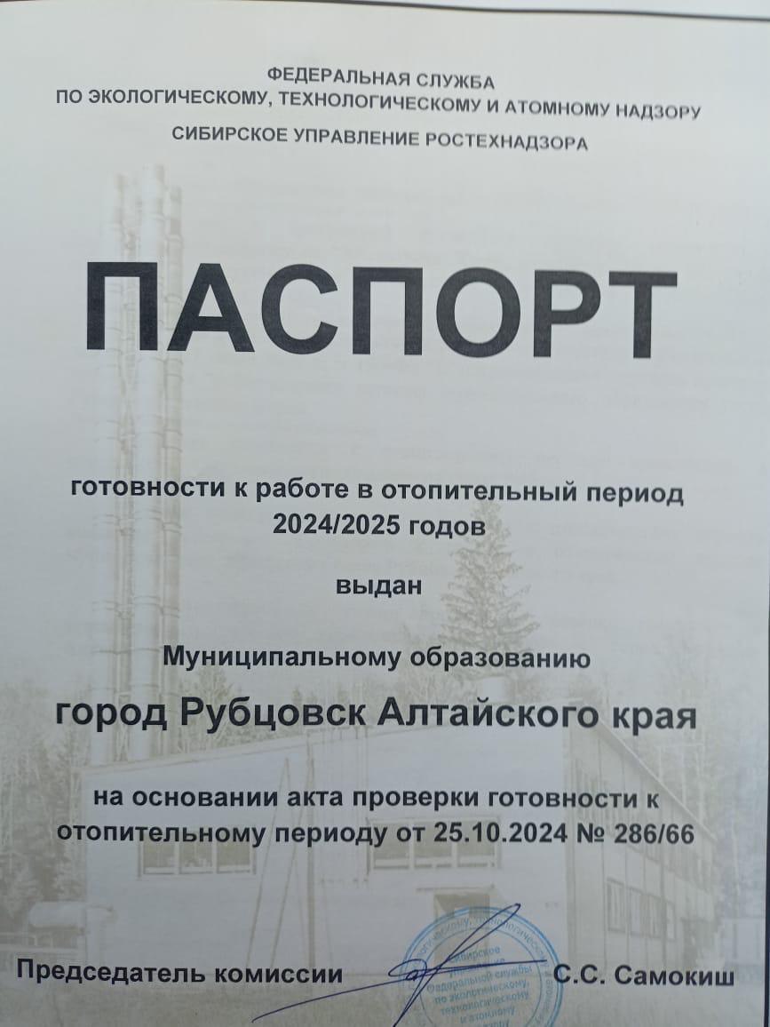 Рубцовск получил паспорт готовности к работе в отопительный период 2024/2025 годов.