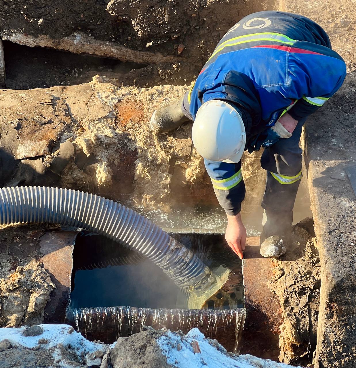 Сейчас проводится первый этап ремонтных работ – откачка воды из лотка теплотрассы. На поврежденном участке работает мотопомпа, способная откачивать 300 куб. м. воды в час, а также ассенизаторские машины. Данные работы проводятся с целью обеспечения доступа специалистам для проведения работ по вырезке технологического отверстия на верхней части трубопровода с последующей откачкой воды из самой системы отопления. После выполнения этих работ специалисты СГК приступят к сварочным работам.