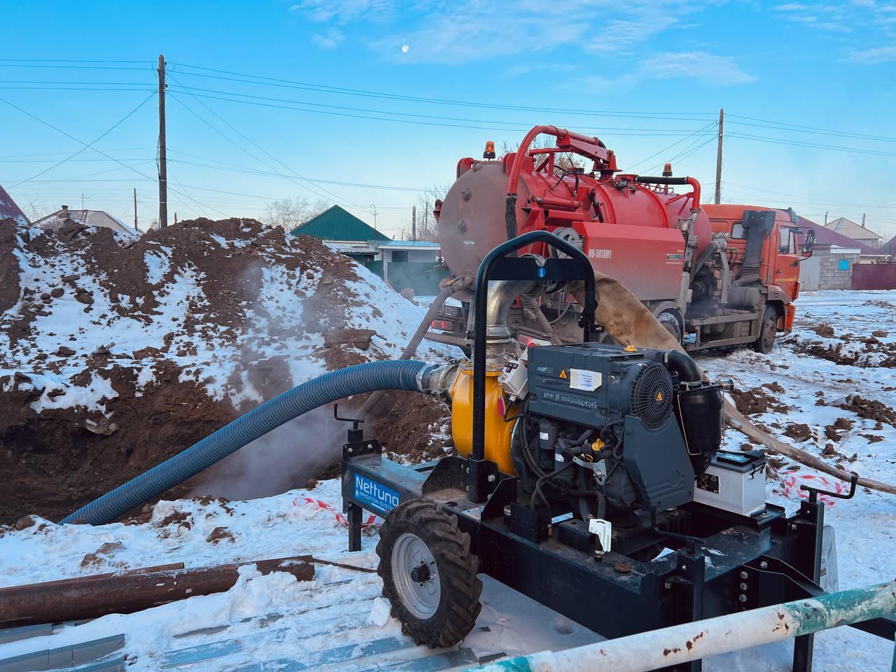 Специалисты СГК выполнили работы по вырезке технологического отверстия на верхней части трубопровода, сейчас с помощью помпы откачивают воду из магистрали.