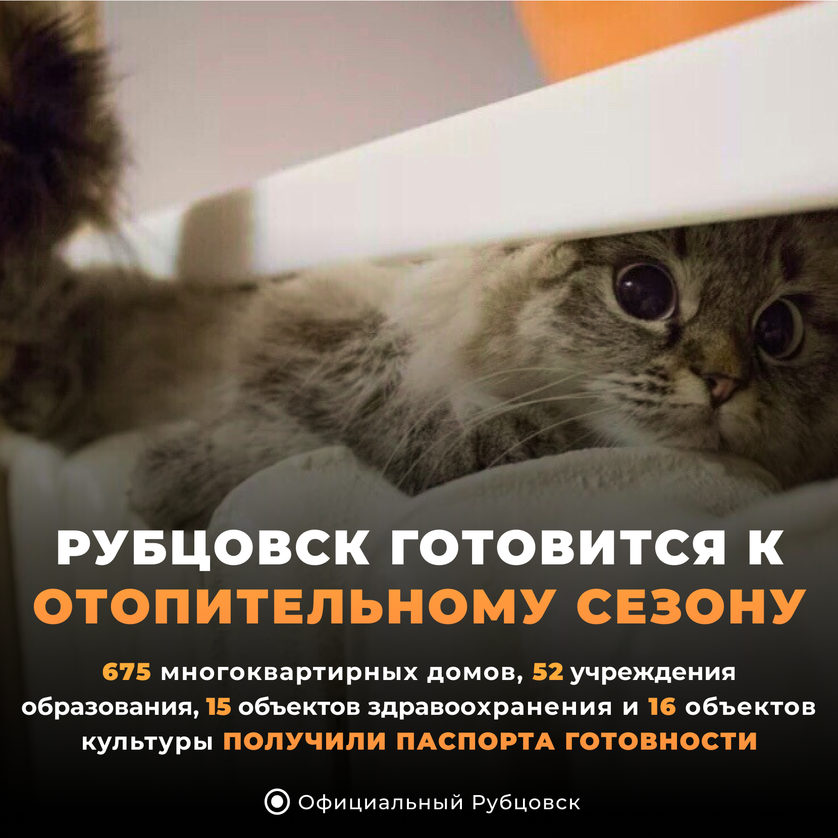 В настоящее время получили паспорта готовности к предстоящему отопительному сезону: 675 многоквартирных домов, 52 учреждения образования, 15 объектов здравоохранения и 16 объектов культуры, также паспорта готовности к отопительному сезону получили МУП "Рубцовский Водоканал" и АО "Рубцовский теплоэнергетический комплекс".