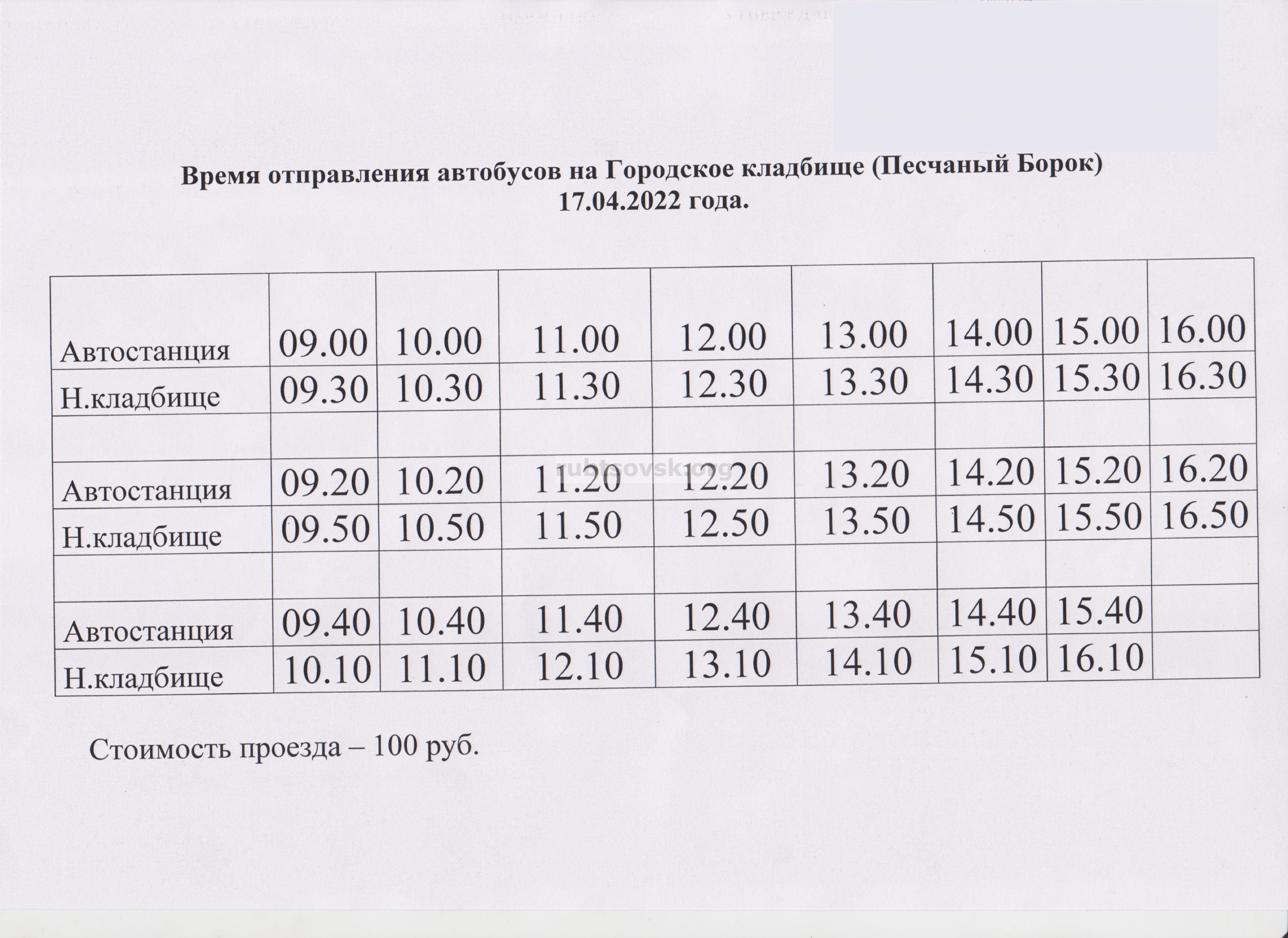 Администрация города извещает жителей Рубцовска, что в связи с православными праздниками 17 апреля 2022 года будут организованы перевозки пассажиров по маршруту «г. Рубцовск – городское кладбище (Песчаный Борок)» с автостанции города Рубцовска.
