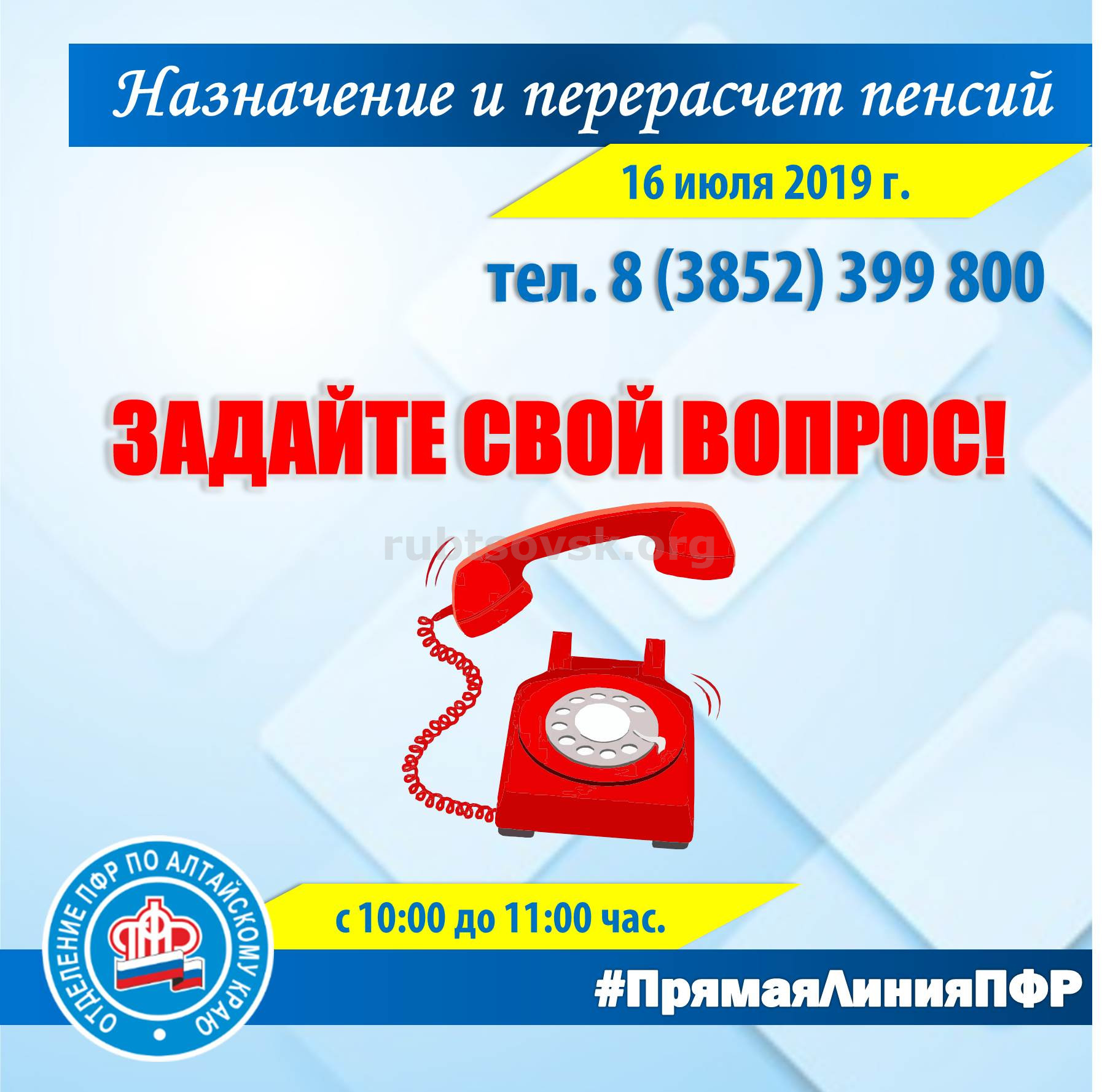 16 июля, во вторник, Отделение Пенсионного фонда РФ по Алтайскому краю проведёт «прямую телефонную линию» для жителей региона по вопросам назначения и перерасчета пенсий.